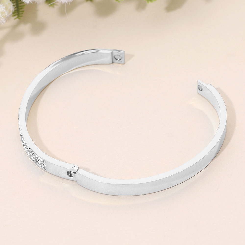 Details • Size : 0.25" H, 2.3" D • Hinged Closure • Water Resistant • Sophisticated hinge bangle bracelet featuring three rows of delicate crystal accents set into a sleek polished silhouette for radiant sparkle and refined style. Designed for effortless wear, it transitions seamlessly from everyday outfits to evening looks, adding timeless elegance when worn alone or layered. • Hypoallergenic • Stainless Steel