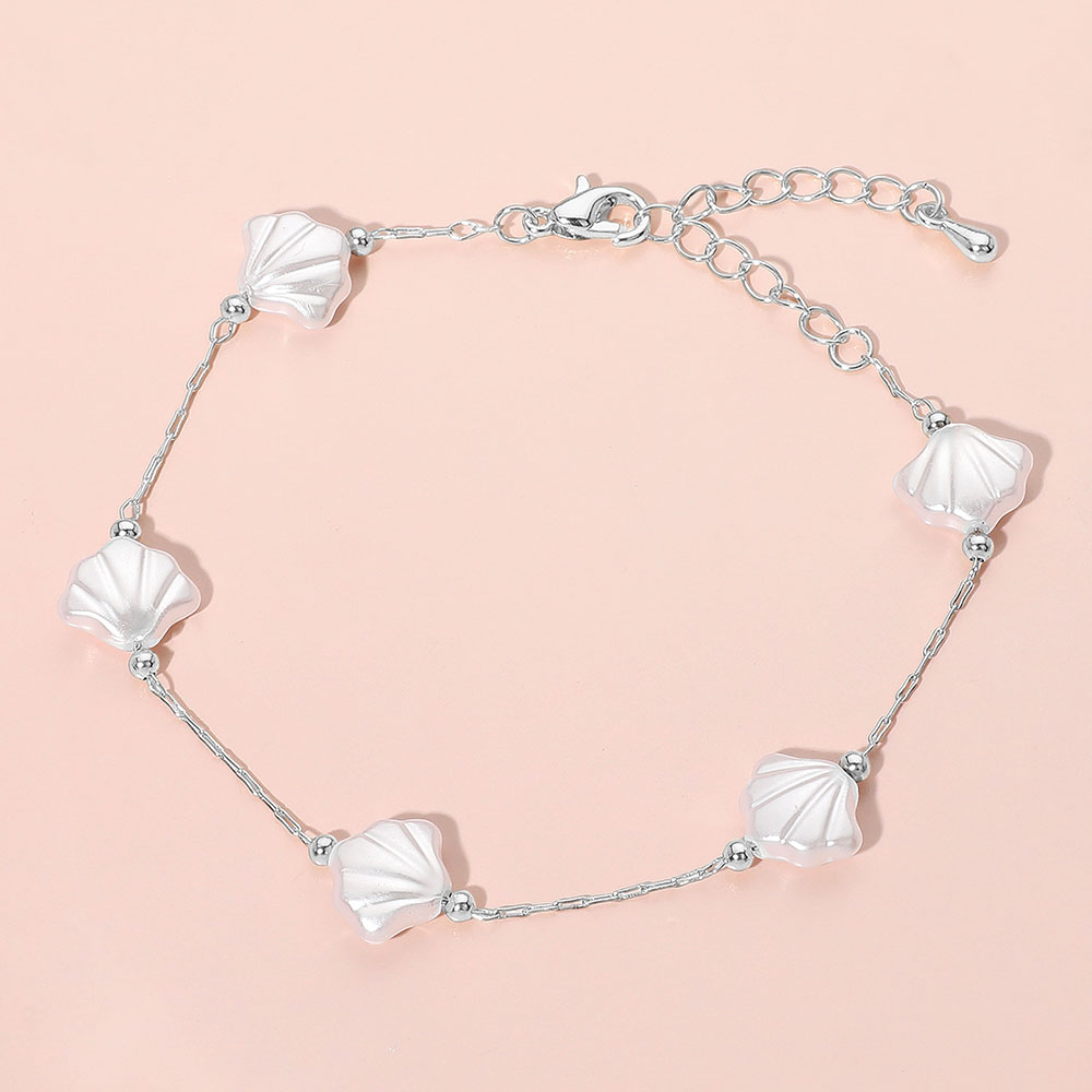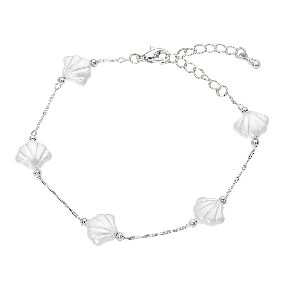 Details • Size : 0.4" H, 7" + 1.75" L • Lobster Clasp Closure • Embrace coastal charm with this delicate shell charm bracelet, featuring pearlescent shell-shaped beads on a fine gold / silver chain. Adjustable for the perfect fit, this lightweight and elegant piece is ideal for summer outfits, vacations, or everyday boho-chic style. A must-have accessory for ocean lovers and beach babes. • Lead and Nickel Compliant • Brass