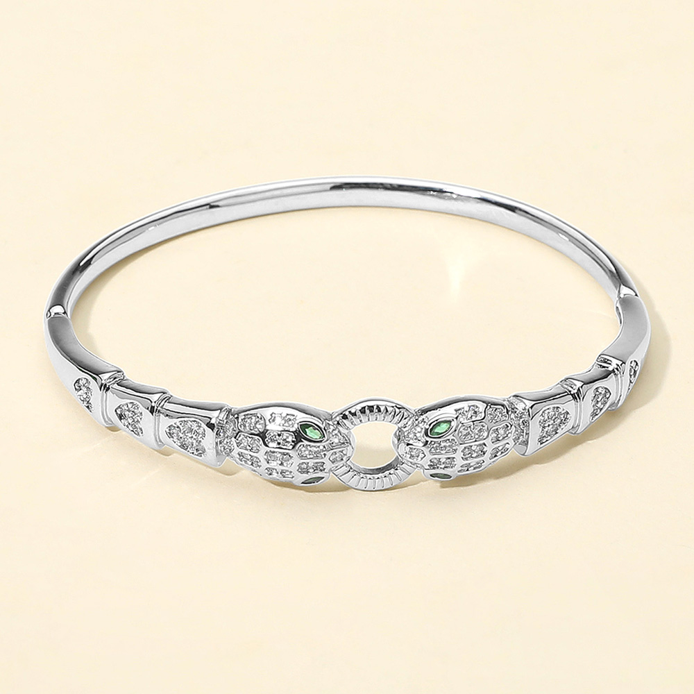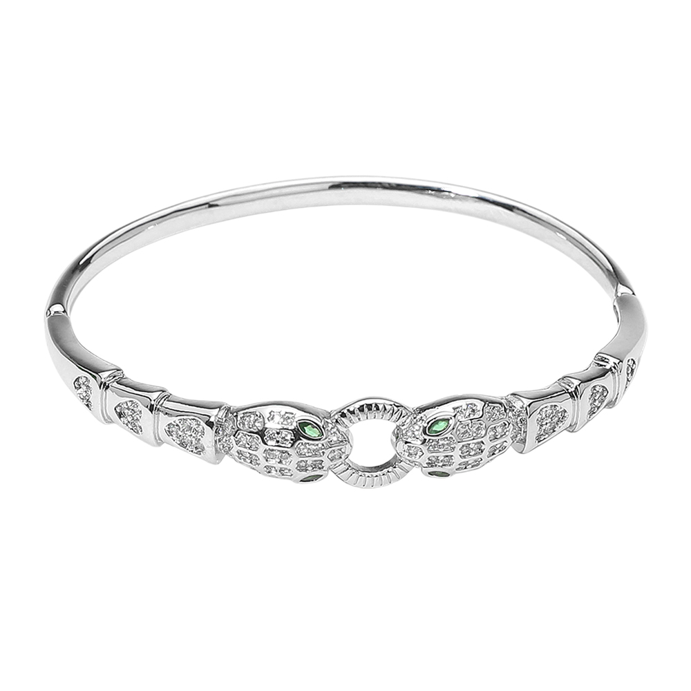 Details • Size : 0.4" H, 2.25" D • Hinged Closure • Fierce yet refined, this gold bangle bracelet showcases dual panther heads adorned with sparkling crystals and striking green eyes. A bold accessory that symbolizes strength and elegance, making it the perfect statement piece for evening looks or everyday sophistication. • CZ Cubic Zirconia • Sterling Silver Dipped