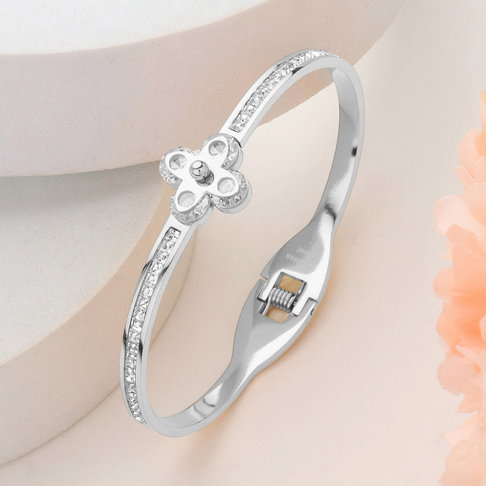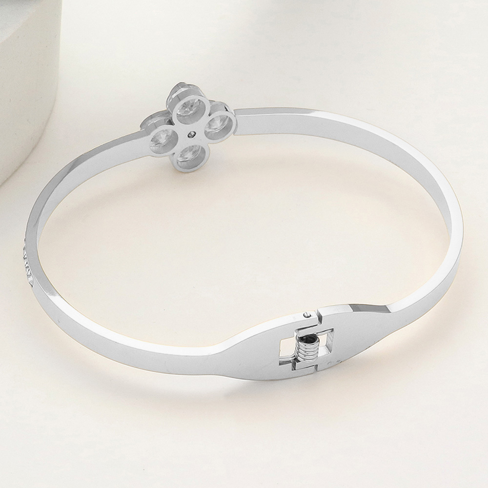 Details • Size : 0.6" H, 2.4" D • Hinged Closure • A refined bangle bracelet featuring a radiant quatrefoil centerpiece adorned with sparkling crystals. The sleek band is accented with shimmering details, offering a sophisticated touch that transitions seamlessly from everyday elegance to special occasions. • CZ Cubic Zirconia • Stainless Steel