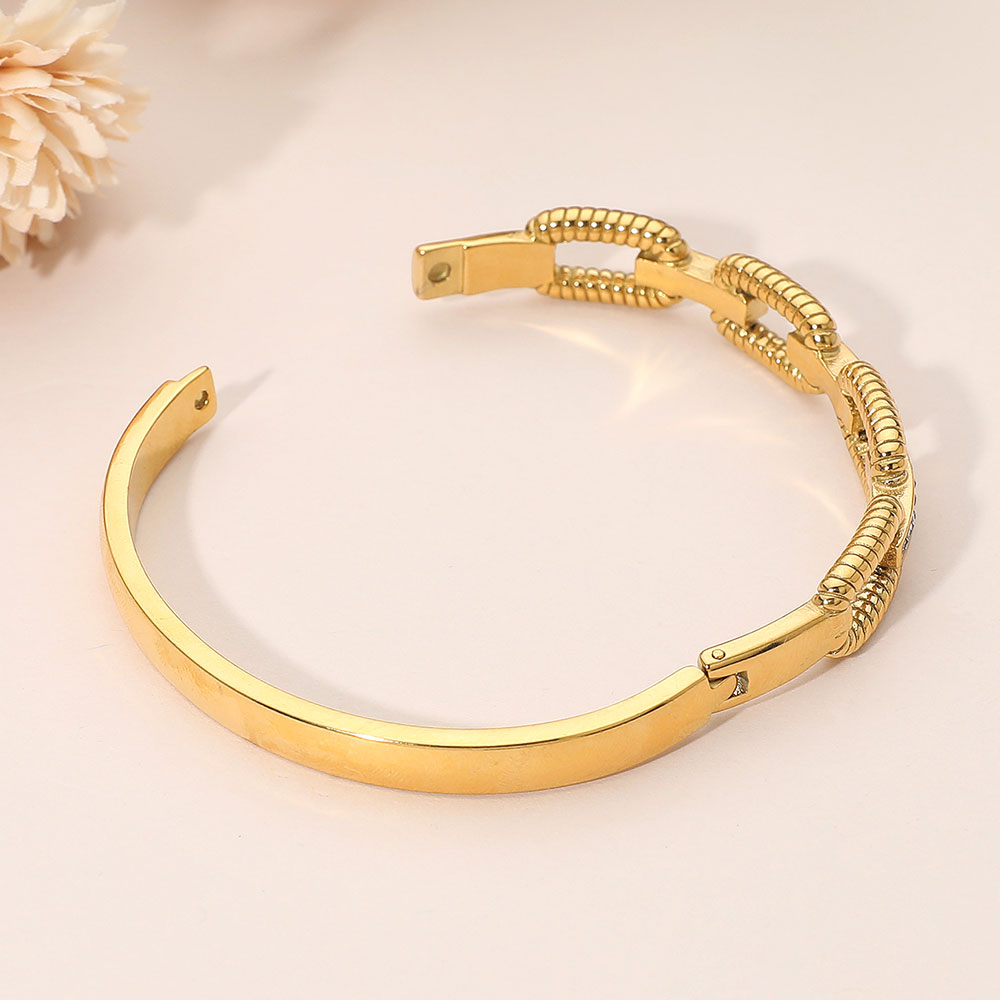 Details • Size : 0.4" H, 2.3" D • Hinged Closure • Statement bangle designed with bold interlocking link details and subtle accent sparkle for a sophisticated, modern finish. Easy to wear and comfortable for daily styling, perfect for stacking or as a standout solo piece to elevate casual and dress outfits alike. • CZ Cubic Zirconia • Stainless Steel