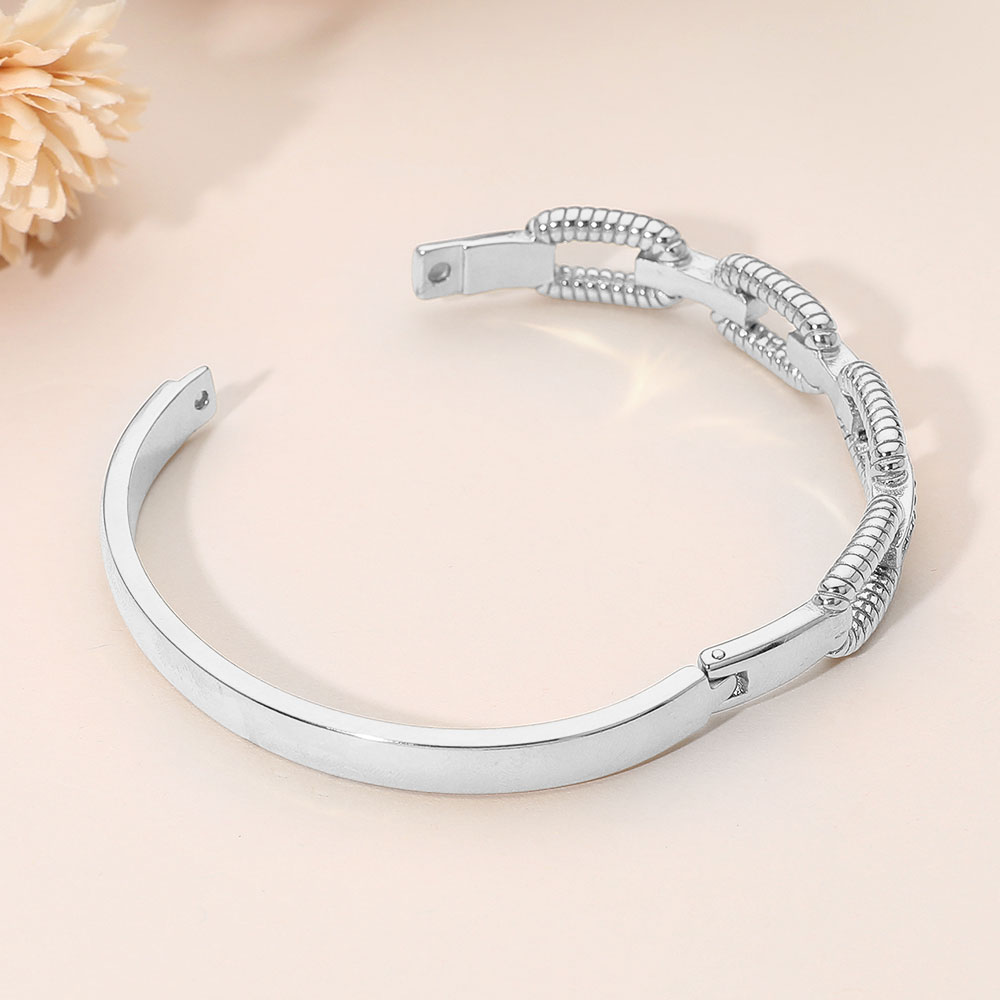 Details • Size : 0.4" H, 2.3" D • Hinged Closure • Statement bangle designed with bold interlocking link details and subtle accent sparkle for a sophisticated, modern finish. Easy to wear and comfortable for daily styling, perfect for stacking or as a standout solo piece to elevate casual and dress outfits alike. • CZ Cubic Zirconia • Stainless Steel