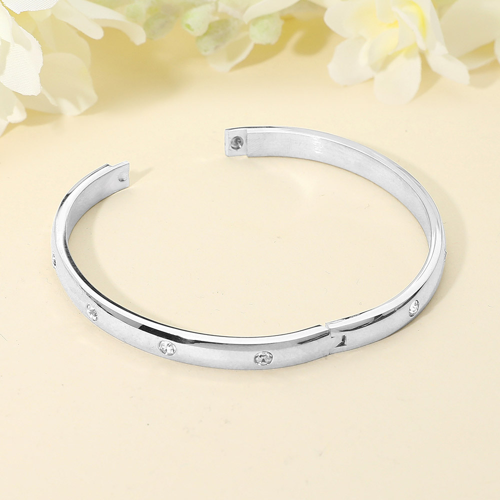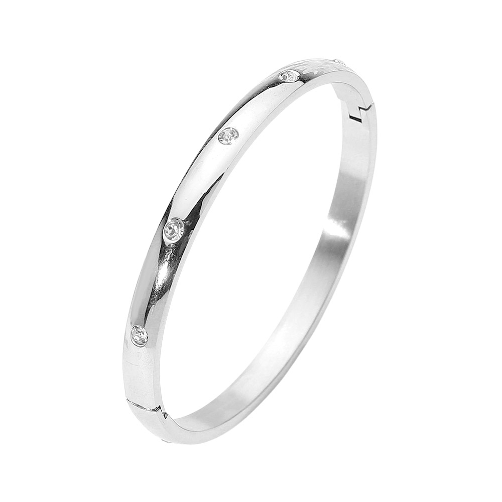 Details • Size : 0.25" H, 2.5" D • Hinged Closure • This stainless steel bangle features a sleek, polished surface adorned with shimmering crystal accents for a refined touch. Its timeless, minimalist design offers both elegance and versatility, making it a perfect accessory to complement day-to-night ensembles with effortless charm. • CZ Cubic Zirconia • Stainless Steel