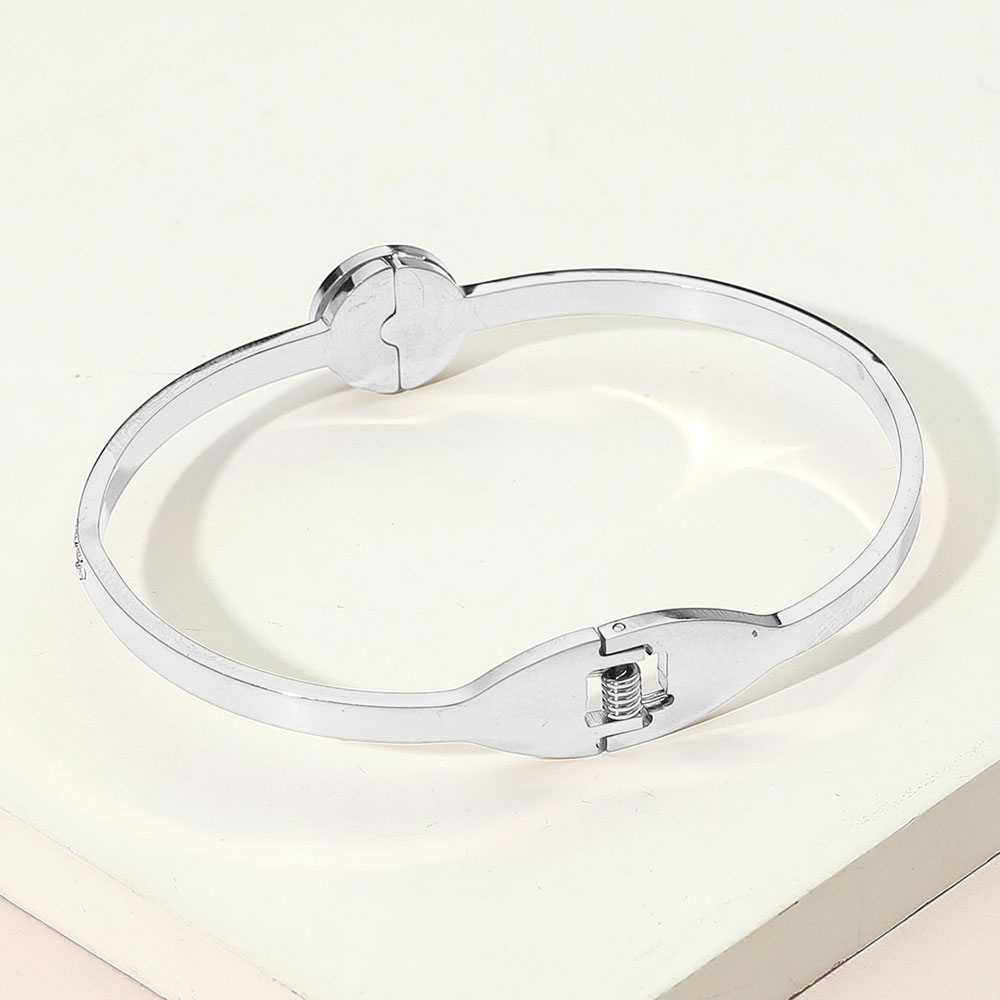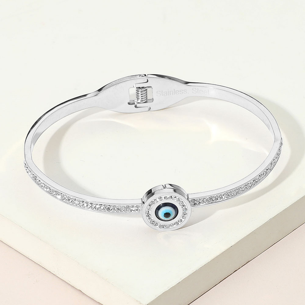 Details • Size : 0.5" H, 2.4" D • Hinged Closure • Sleek bracelet crafted from stainless steel featuring a protective evil eye charm at the center, surrounded by shimmering crystals. A refined accessory that blends modern elegance with symbolic meaning. • CZ Cubic Zirconia • Stainless Steel