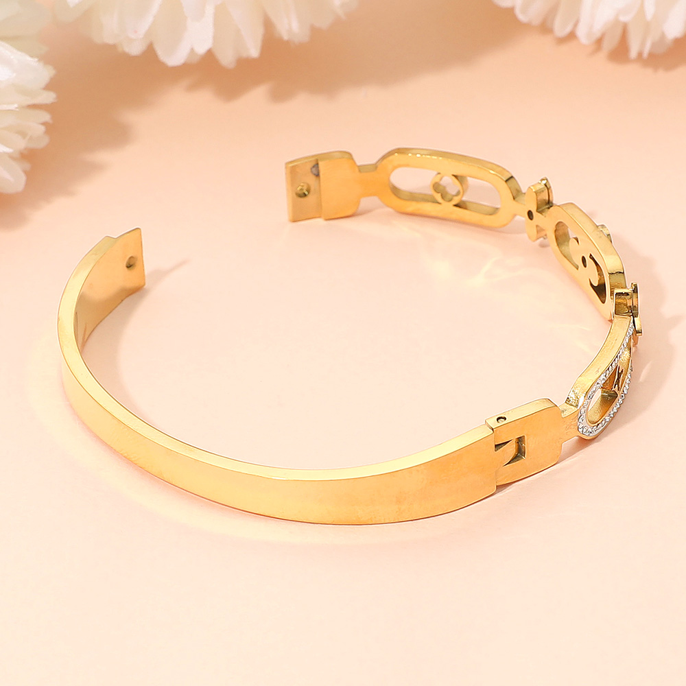 Details • Size : 0.3" H, 2.3" D • Hinged Closure • Chic bangle bracelet featuring a mix of clover motifs and geometric links, highlighted with sparkling crystal details. A sophisticated piece that blends elegance and modern style, making it a versatile accessory for casual or formal occasions. • Stainless Steel