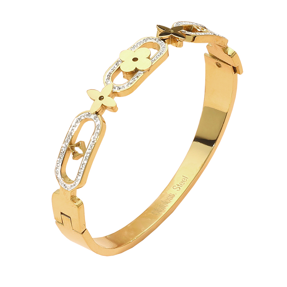 Stainless Steel Geometric Clover Motif Stone Paved Link Hinged Bangle Bracelet