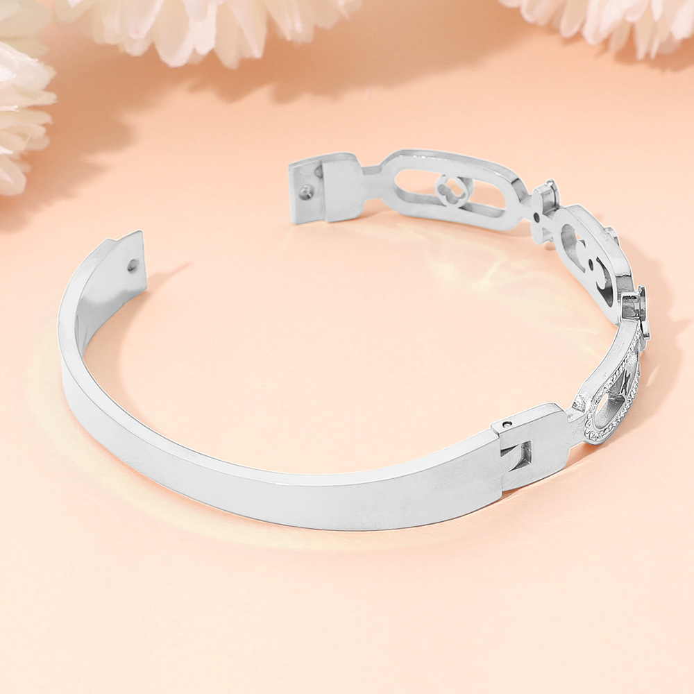 Stainless Steel Geometric Clover Motif Stone Paved Link Hinged Bangle Bracelet