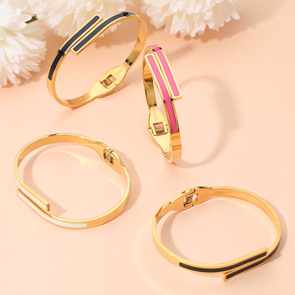 Details • Size : 0.5" H, 2.3" D • Hinged Closure • Elegant bangle bracelet featuring a sleek overlapping design enhanced with a refined inlay detail. Its minimalist yet stylish look makes it a versatile accessory, perfect for adding a touch of sophistication to everyday outfits or evening ensembles. • Stainless Steel