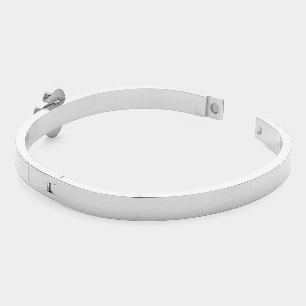 Stainless Steel Quatrefoil CZ Stone Accent Hinged Bangle Bracelet