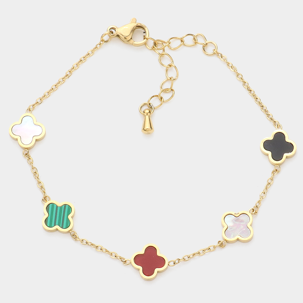 Mother Of Pearl Quatrefoil Pointed Stainless Steel Hinged Bangle Bracelet