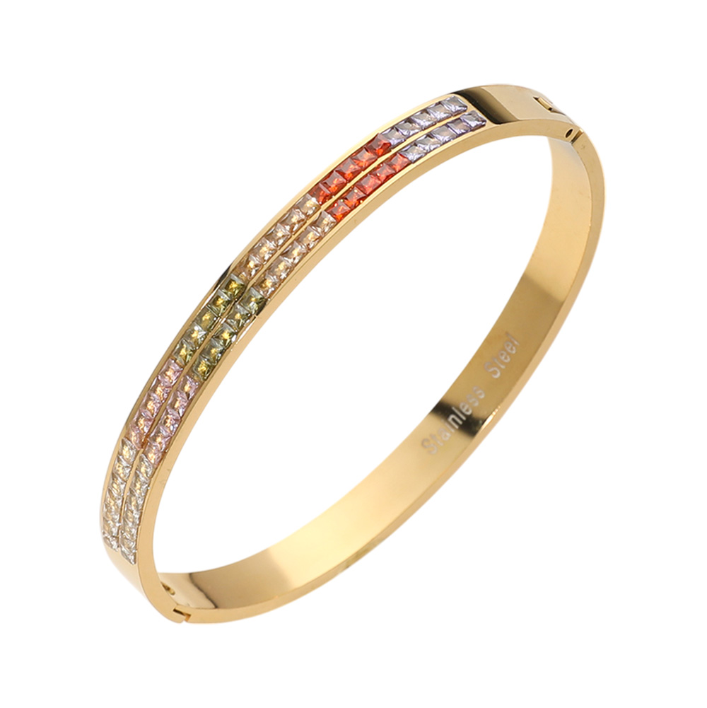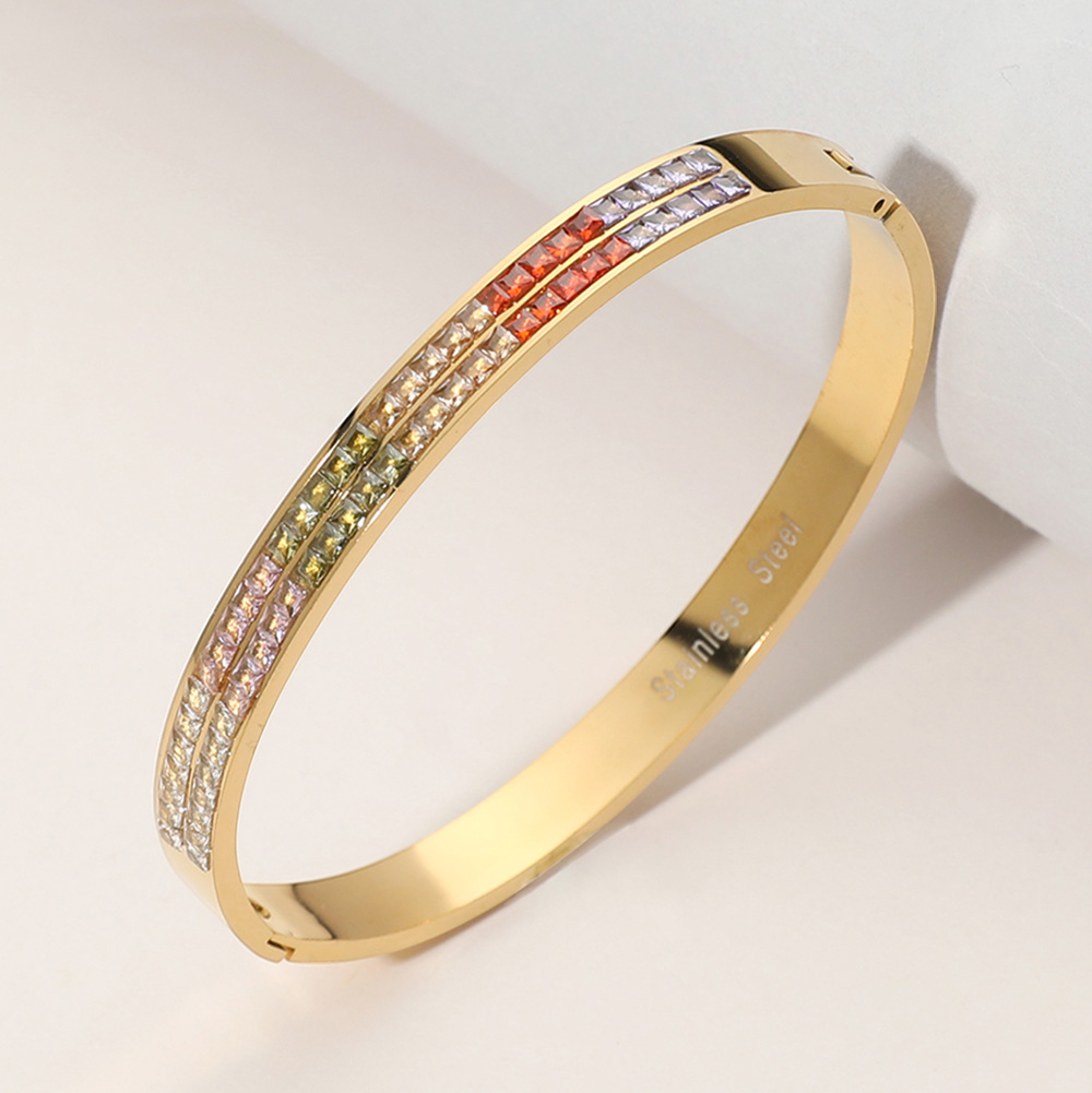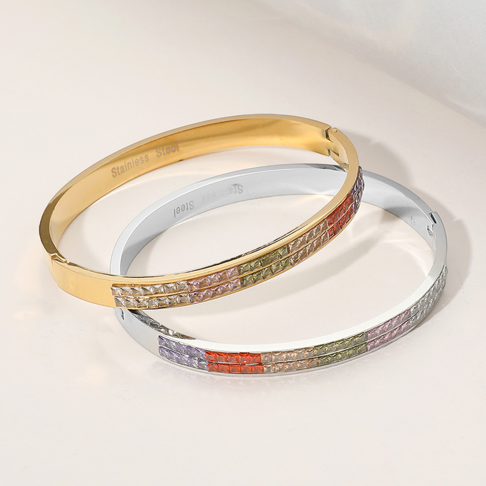 • Sleek stainless steel bangle bracelet featuring a double row of square-cut crystals. A refined, modern accessory perfect for stacking or wearing solo. Durable and stylish for everyday wear.