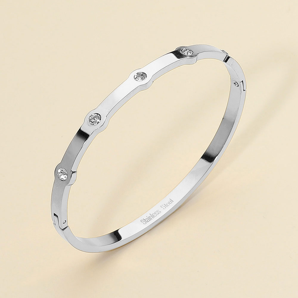 • Delicate slim bangle bracelet featuring evenly spaced round gem accents for a sleek, polished look. Ideal for everyday wear or layered styling with other elegant pieces.