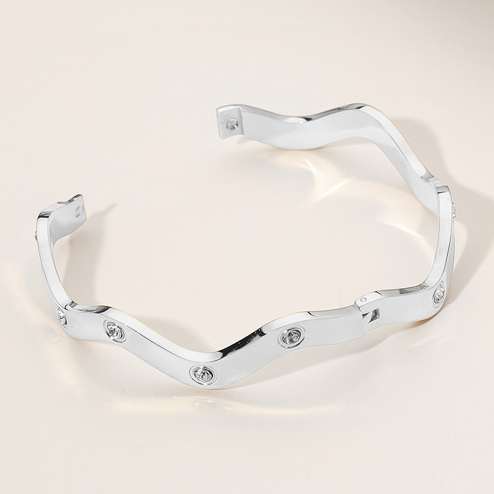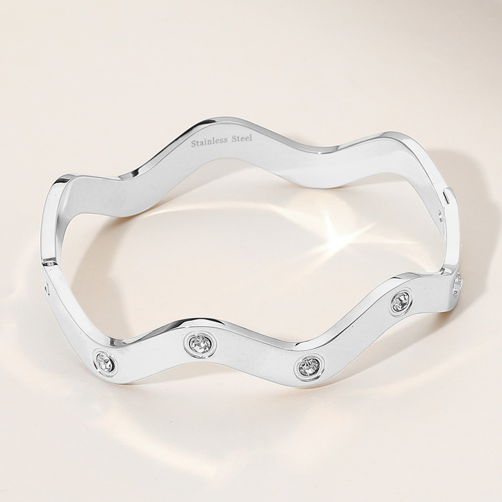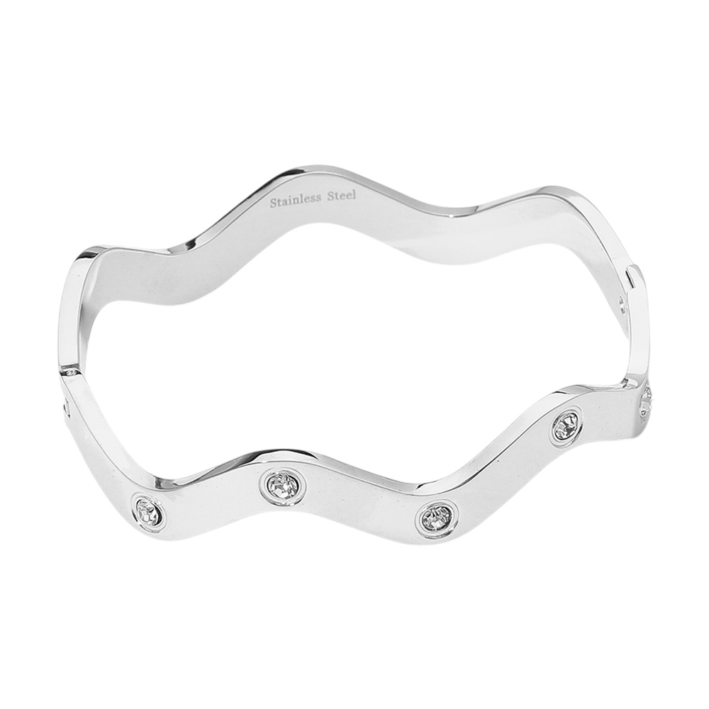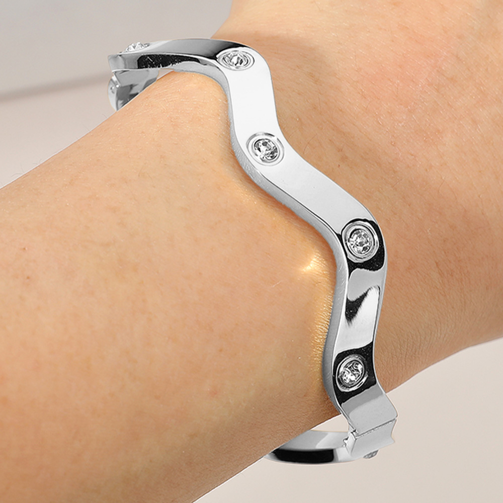 Details • Size : 0.3" H, 2.4" D • Hinged Closure • Stylish bangle bracelet with a unique wavy design and sparkling crystal accents. Perfect for adding modern elegance to any outfit, suitable for both casual wear and special occasions. • Stainless Steel