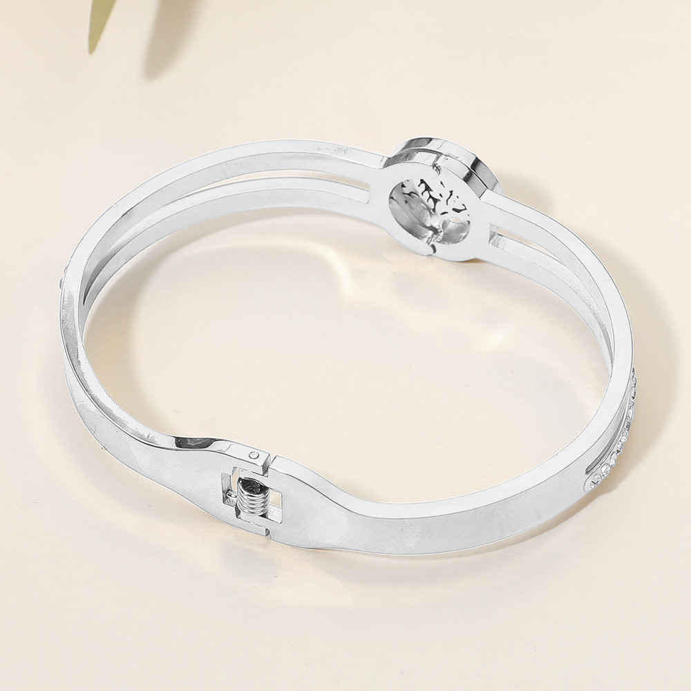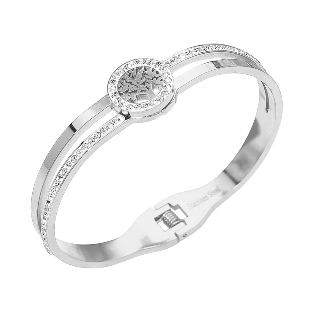 Details • Size : 0.7" H, 2.4" D • Hinged Closure • Celebrate timeless elegance with this tree of life crystal hinged bangle bracelet. Designed with sparkling accents and a symbolic centerpiece, it blends meaning and style. Perfect for stacking or wearing solo, this bracelet adds sophistication to any look from day to night. • Stainless Steel
