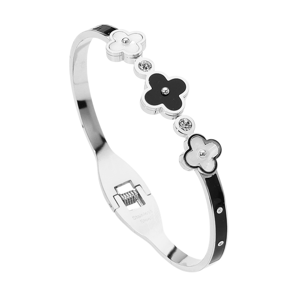 Details • Size : 0.5" H, 2.4" D • Hinged Closure • Refined and stylish, this clover bangle bracelet features alternating quatrefoil motifs with sparkling crystal accents. Its sleek design brings a touch of modern elegance, making it perfect for both everyday wear and special occasions. A versatile accessory that pairs beautifully with any outfit. • Stainless Steel