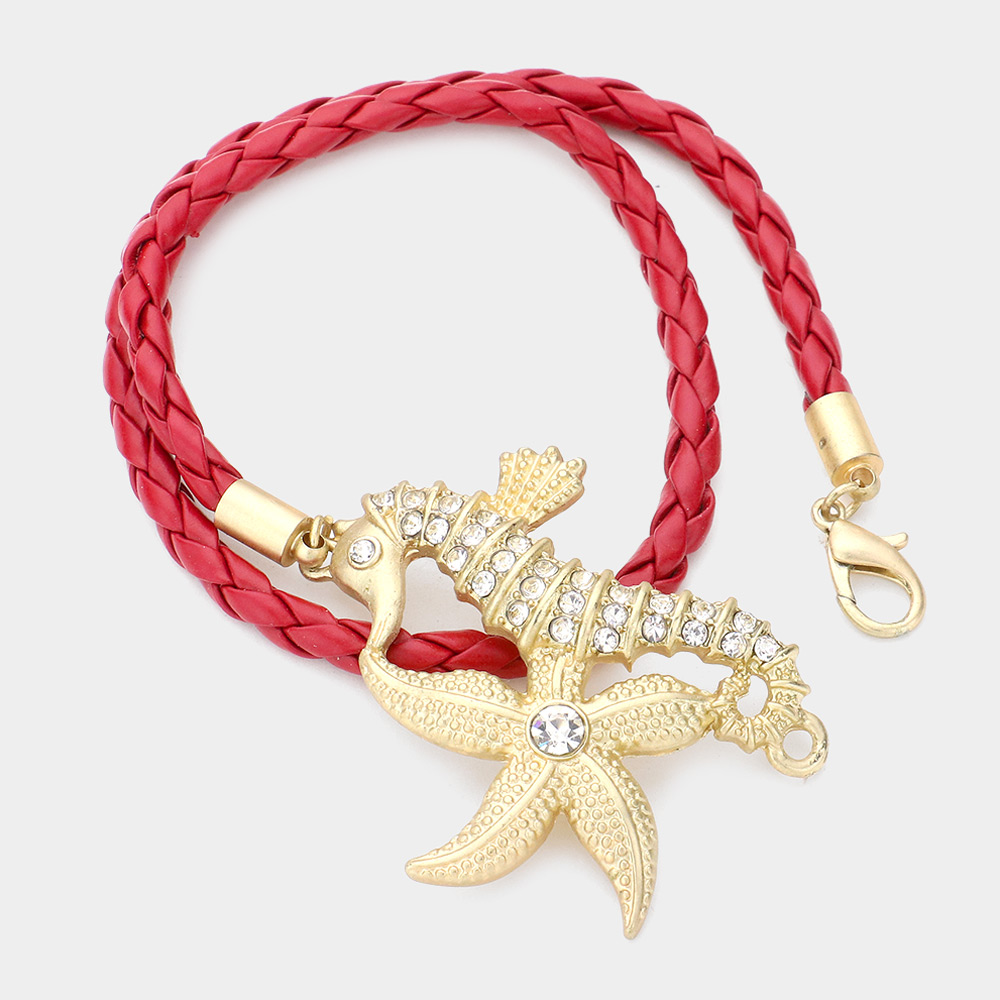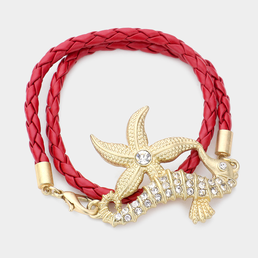 Stone Embellished Starfish Seahorse Braided Faux Leather Wrap Bracelet