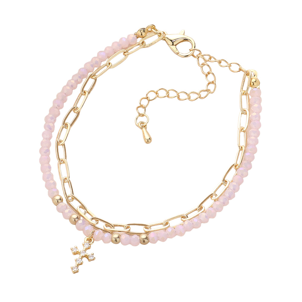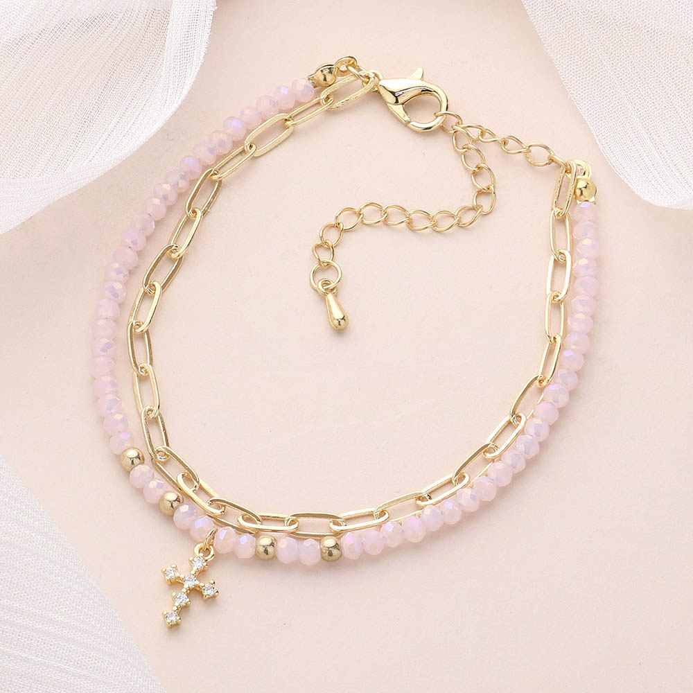 Stone Paved Cross Charm Pointed Beaded Metal Paperclip Chain Layered Bracelet