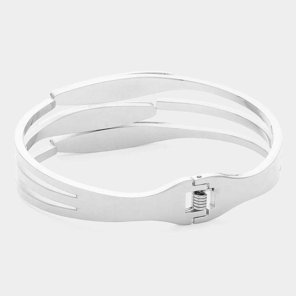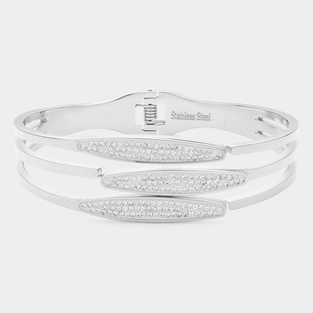 Stone Paved Oval Plate Pointed Stainless Steel Hinged Bangle Bracelet