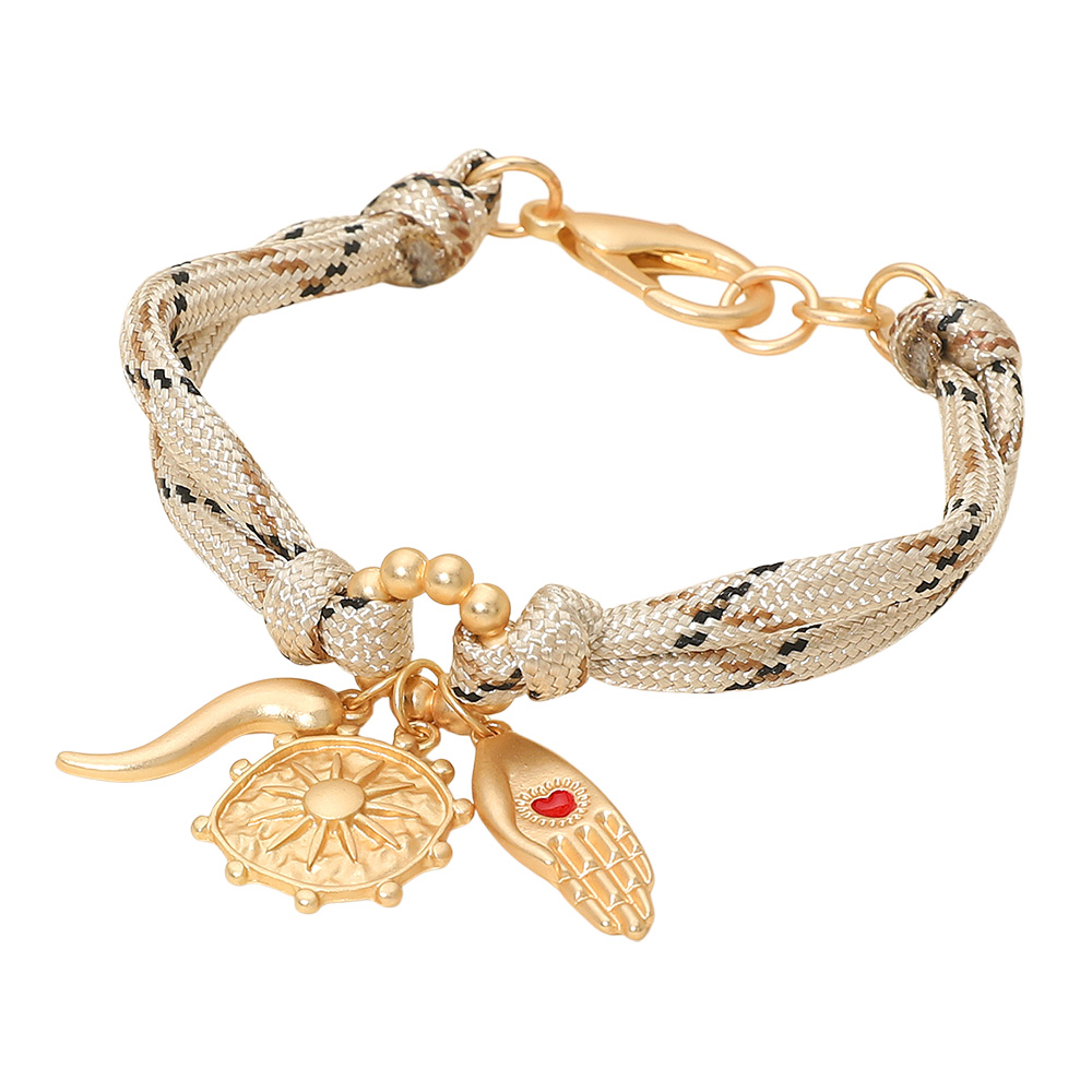 Details • Size : 0.6" H, 7.5" + 0.75" L • Charm Size : 0.75" X 1" • Lobster Clasp Closure • This symbolic charm rope bracelet blends a unique braided design with meaningful accent charms for a standout accessory. Its artistic details create a bold yet versatile look, perfect for adding personality and intrigue to everyday style or layered jewelry combinations. • Lead and Nickel Compliant