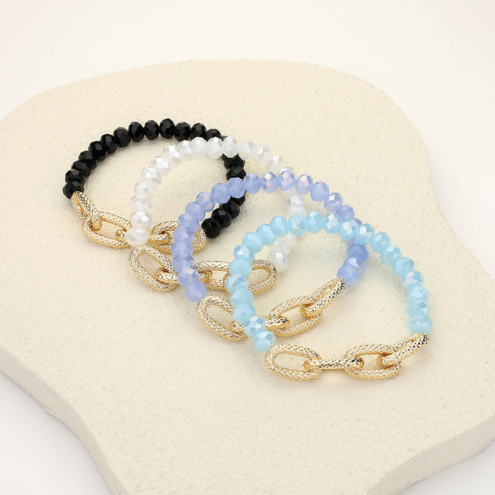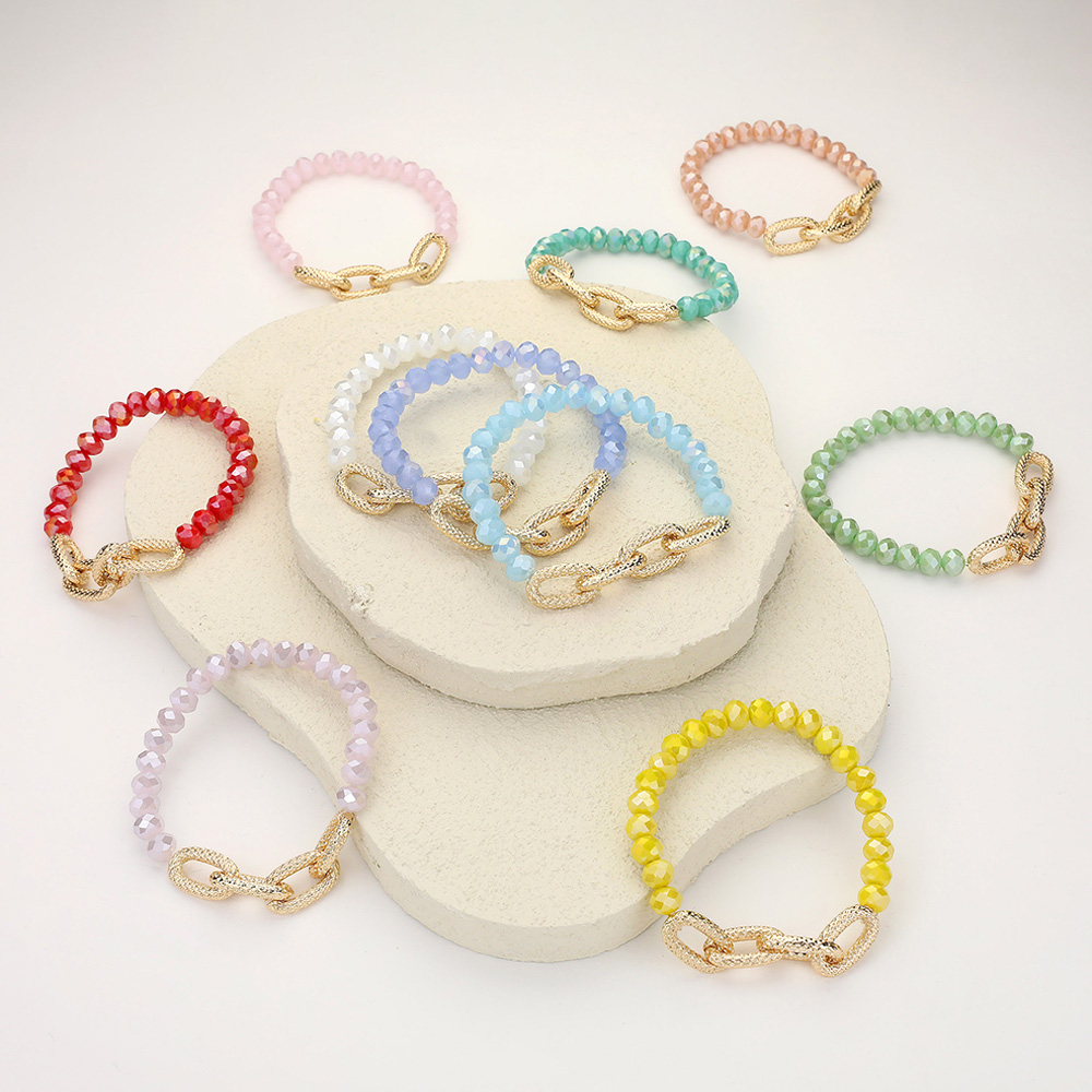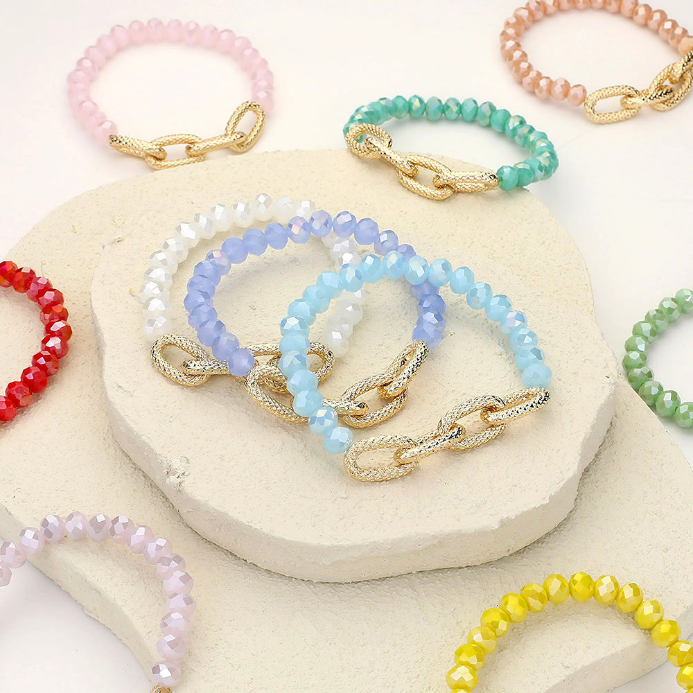 Textured Metal Link Accented Faceted Beaded Stretch Bracelet