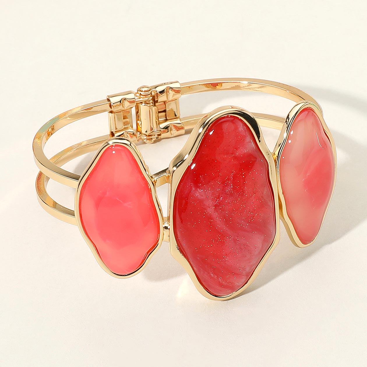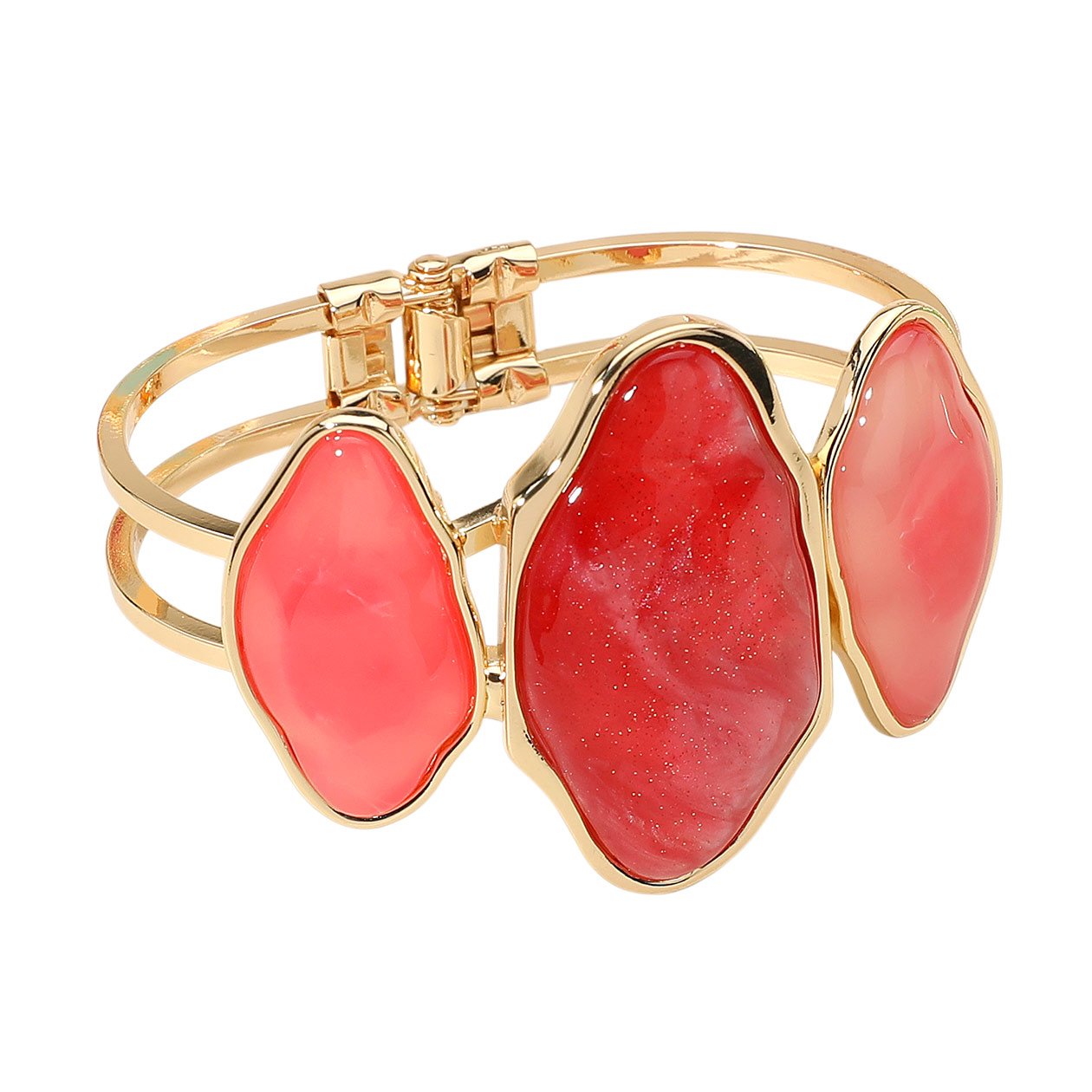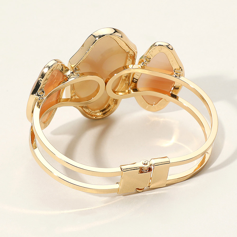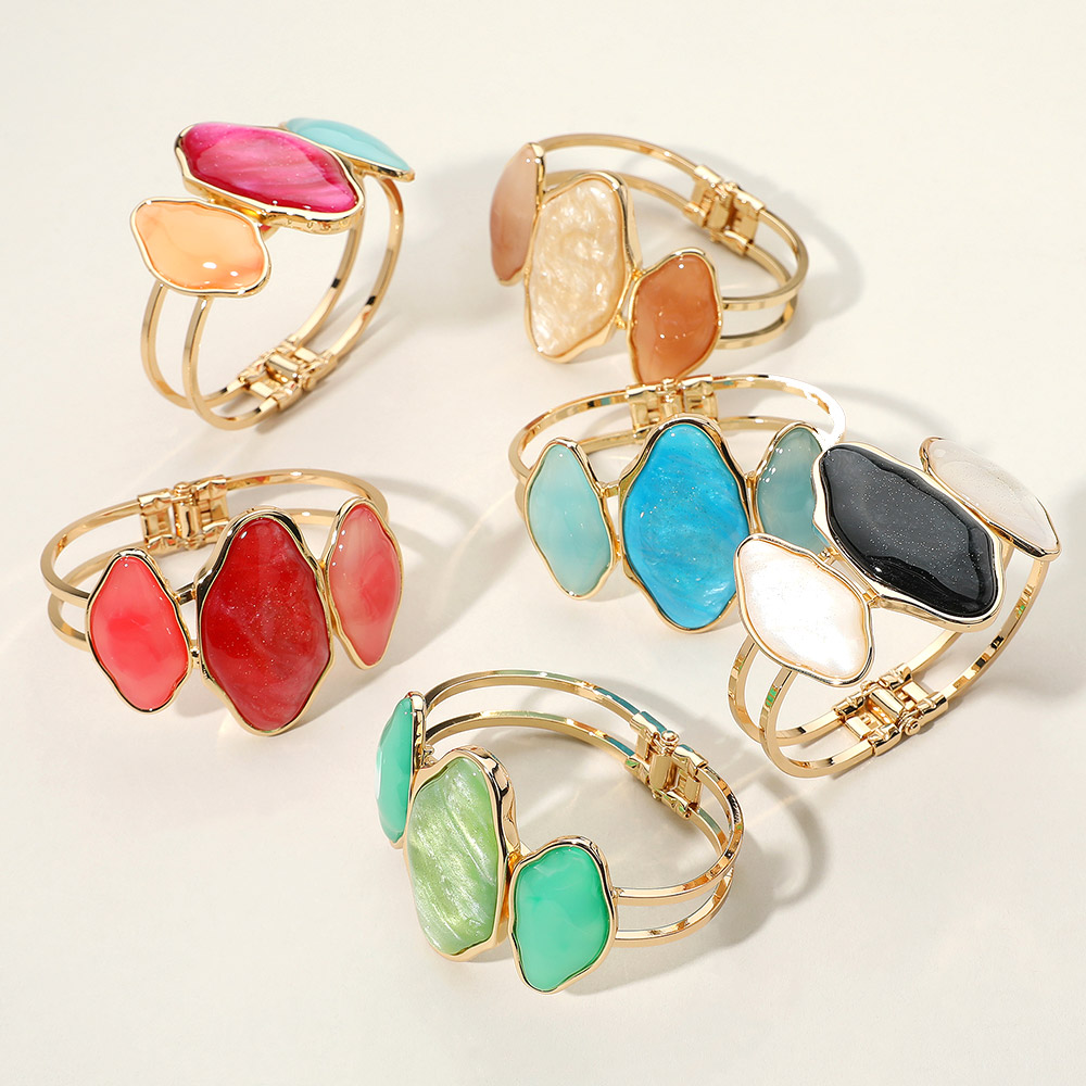 Details • Size : 1.8" H, 2.5" D • Hinged Closure • Statement open cuff bangle featuring three abstract stones in a vibrant arrangement. The dual-band design and hinged closure offer a bold, secure fit perfect for dressing up any look with artistic flair. • Lead and Nickel Compliant