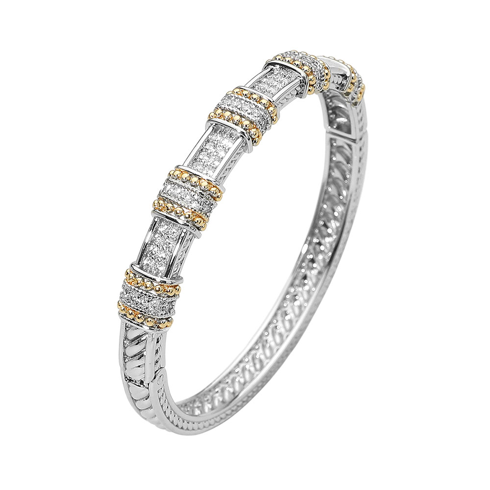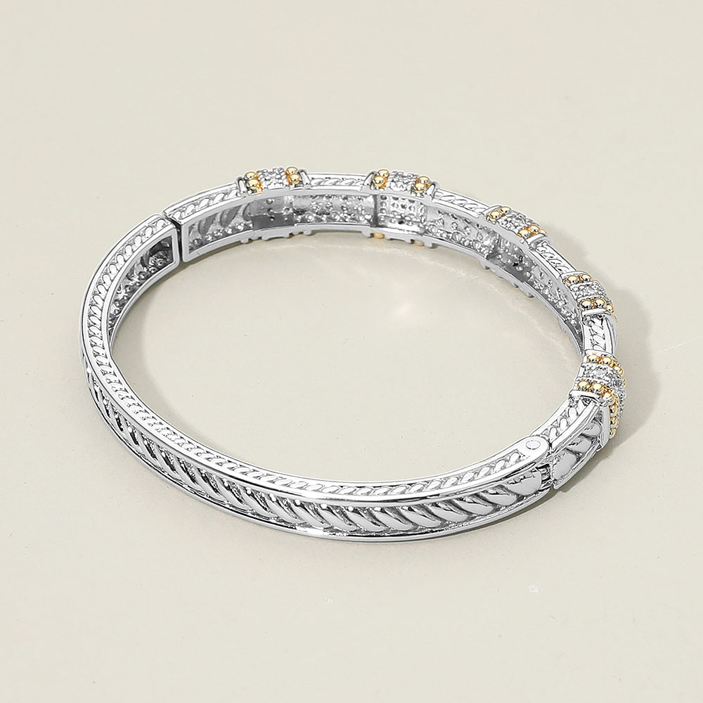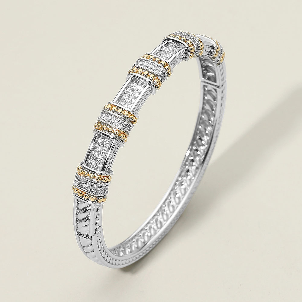 Details • Size : 0.3" H, 2.4" D • Hinged Closure • Sophisticated bangle bracelet featuring geometric sections with sparkling accents and detailed craftsmanship. Perfect for formal or casual wear, this bracelet adds a touch of elegance and luxury to any outfit, making it an ideal accessory or thoughtful gift choice. • CZ Cubic Zirconia
