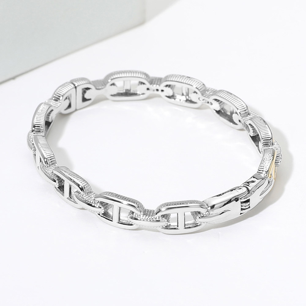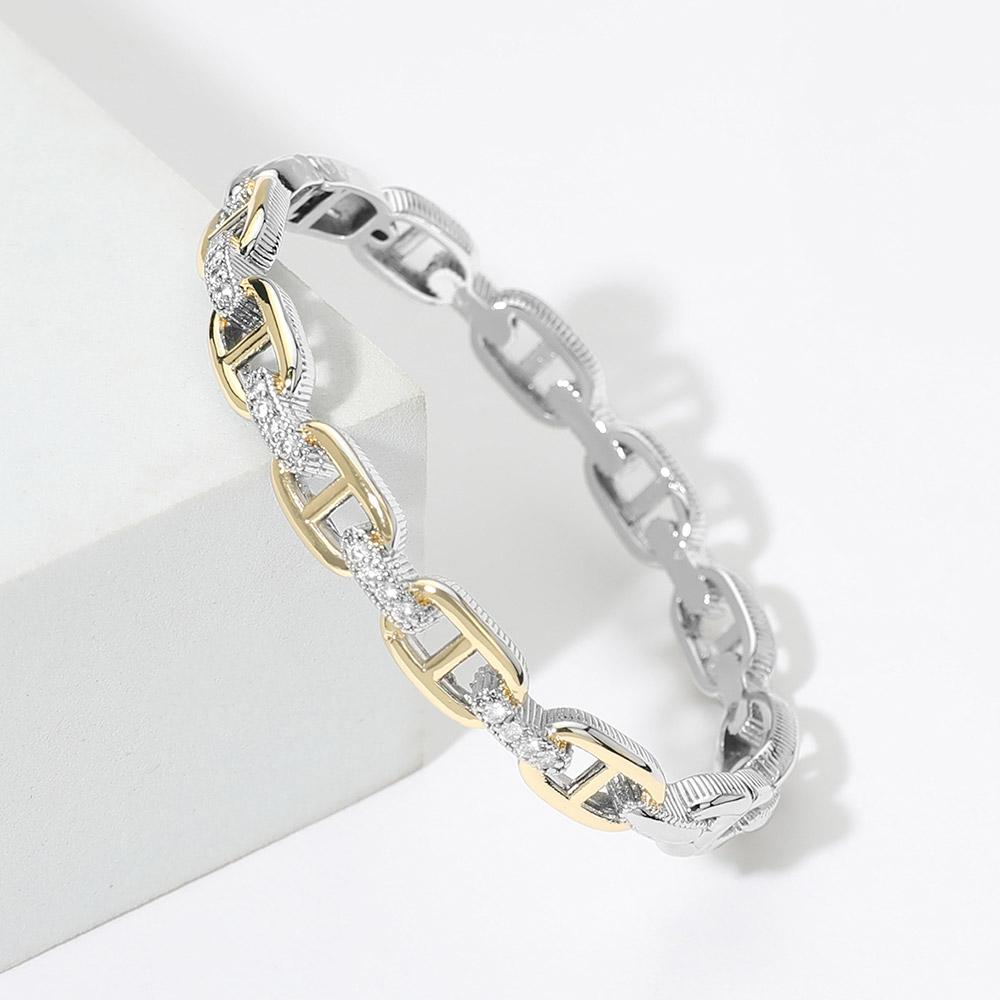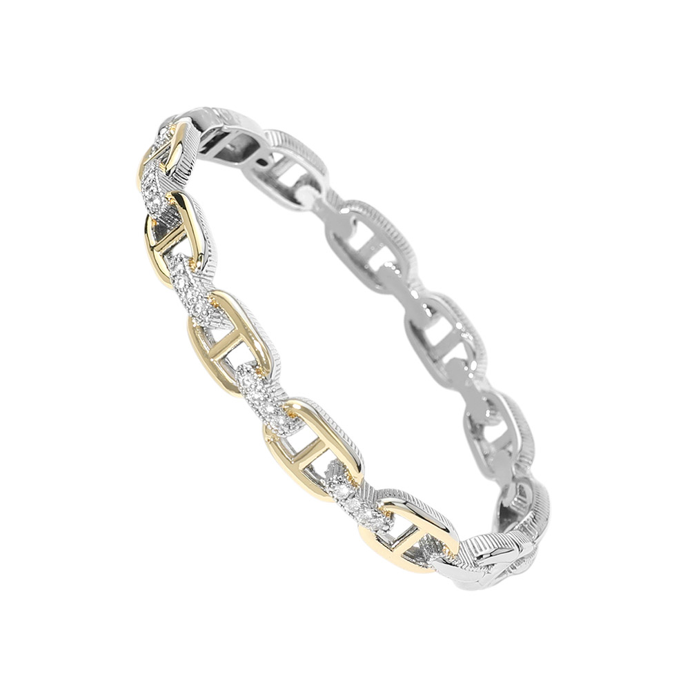 Details • Size : 0.3" H, 2.5" D • Hinged Closure • Elegant two-tone chain link bracelet featuring alternating silver and gold links accented with sparkling crystals. The sleek design combines classic and modern styles, making it a versatile accessory for both casual and formal outfits. A stylish piece that adds sophistication to any jewelry collection. • CZ Cubic Zirconia