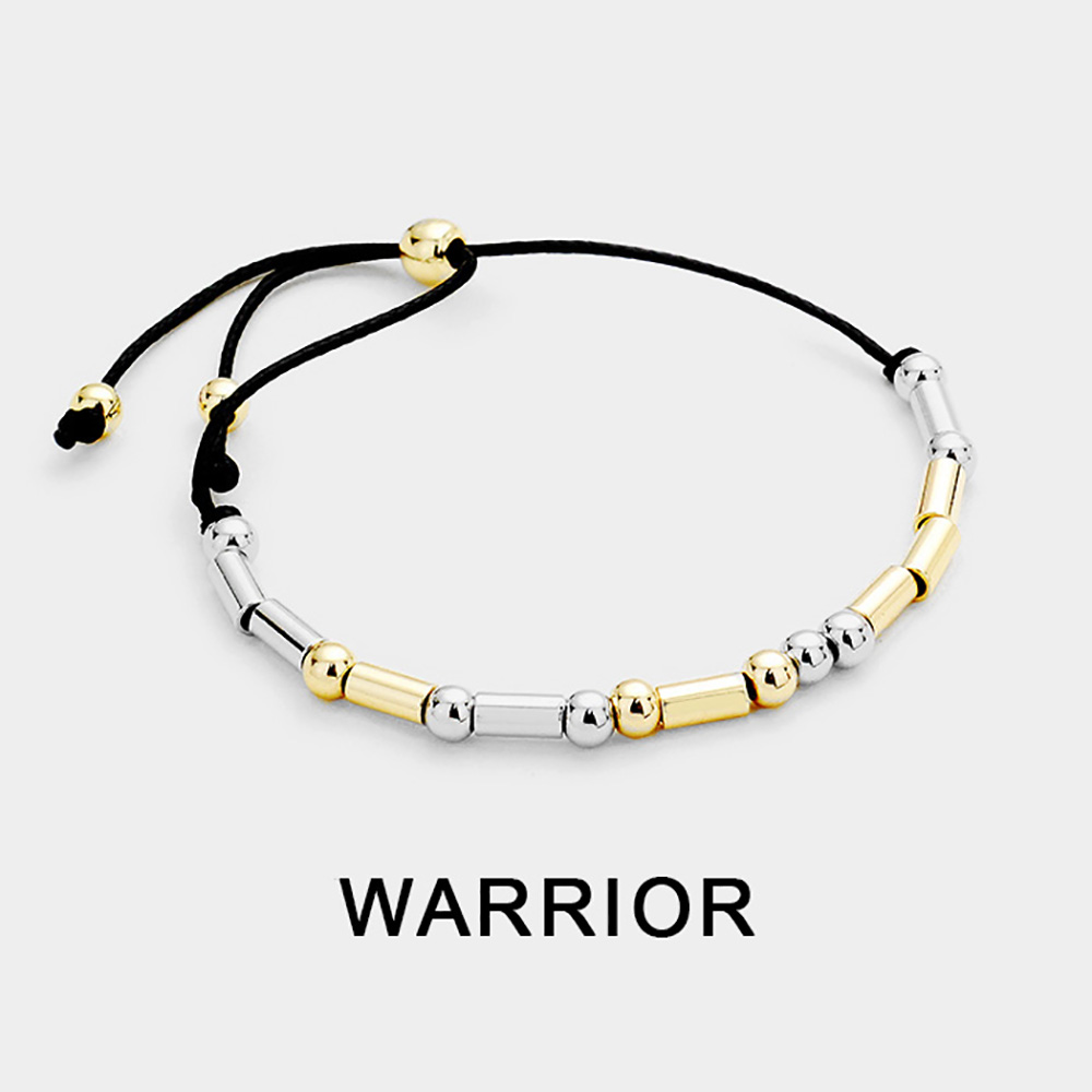 Details • Size : 0.1" H • Adjustable • Celebrate inner strength with this Morse code bracelet spelling WARRIOR. Featuring metallic beads on an adjustable cord, it’s a bold and meaningful accessory symbolizing courage, resilience, and empowerment for everyday wear or gifting. • Lead and Nickel Compliant