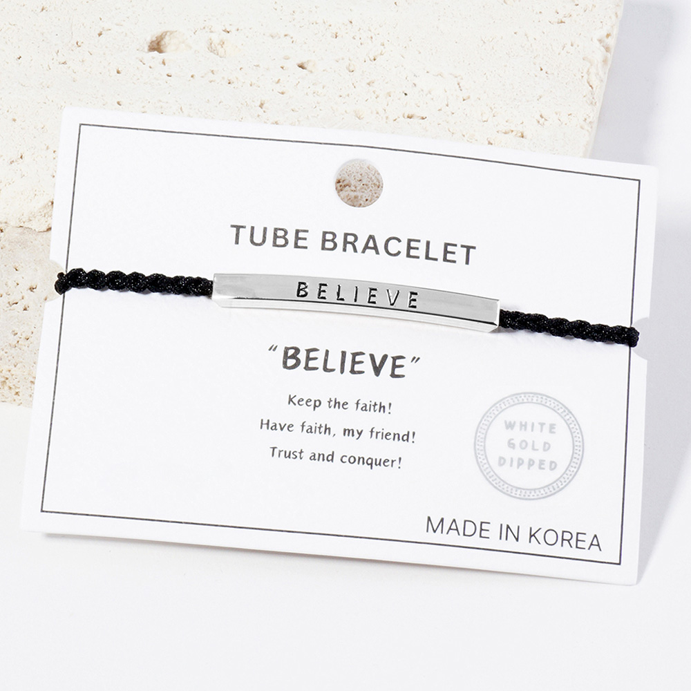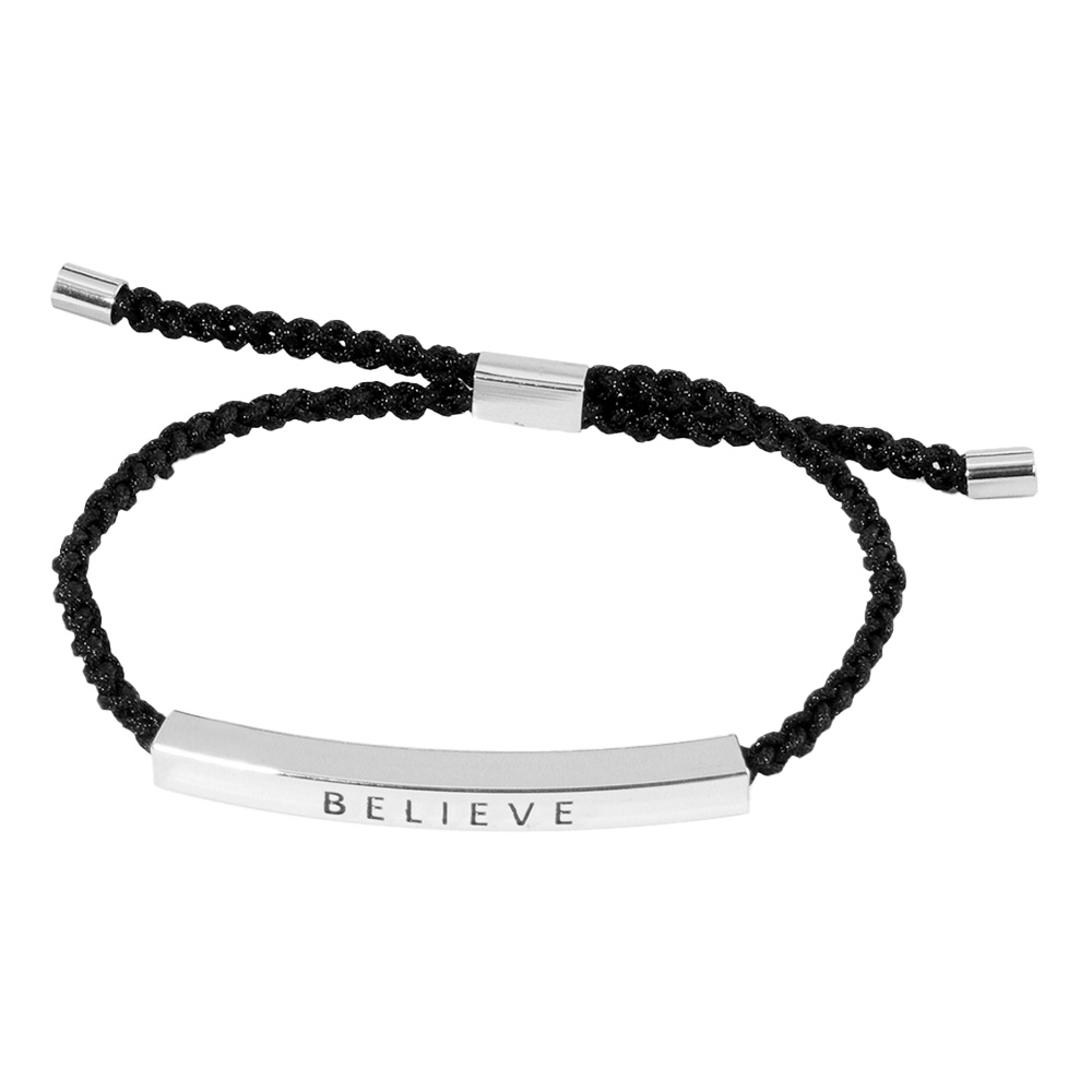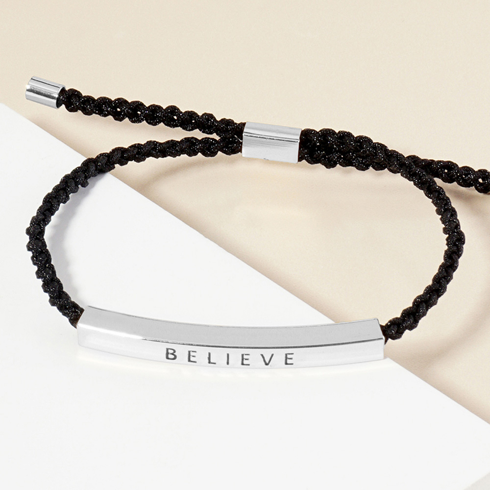 White Gold Dipped BRAVE Message Bar Pointed Rope Adjustable Cinch Pull Tie Bracelet