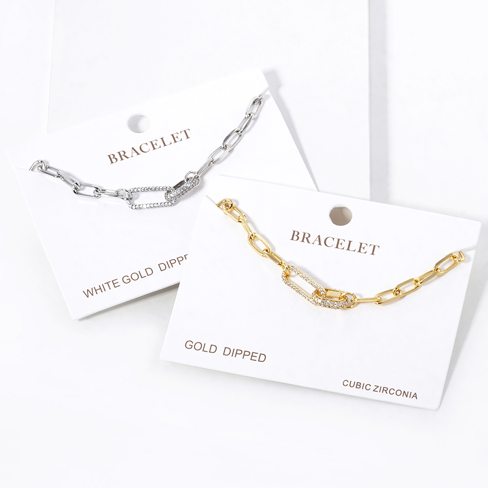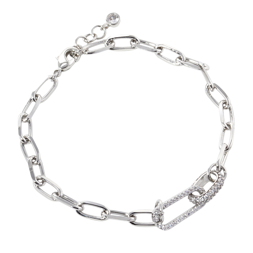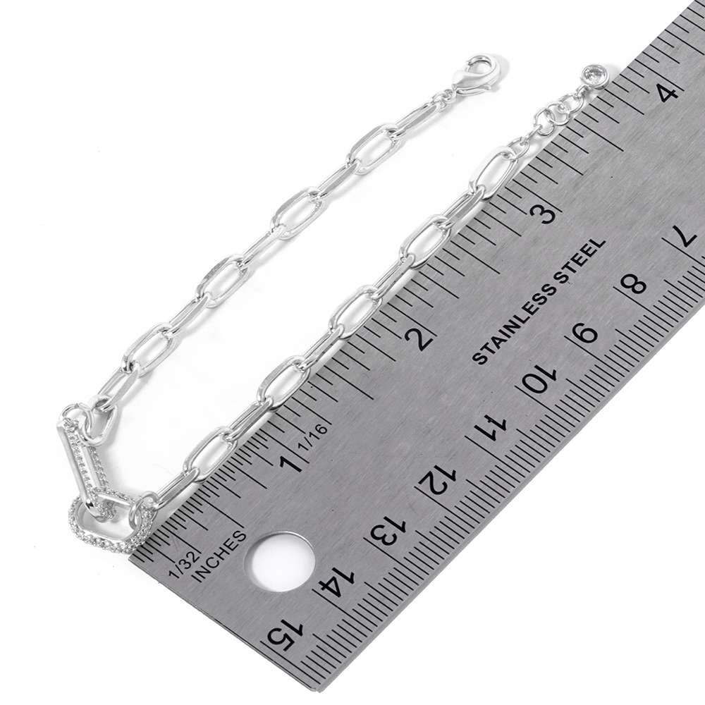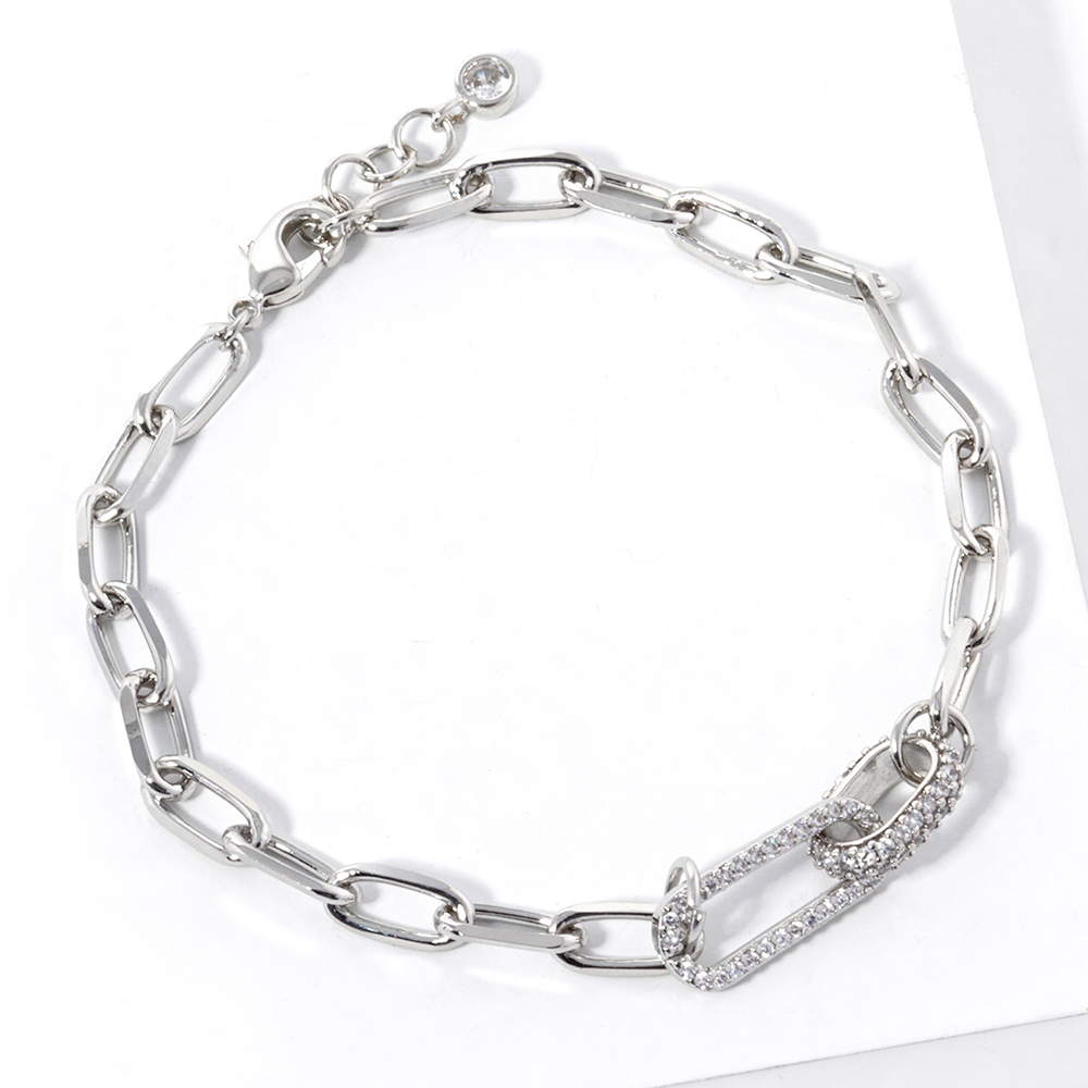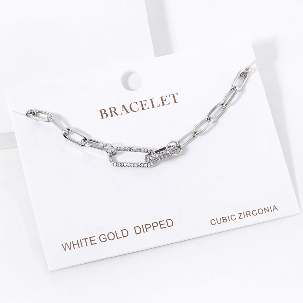 Details • Size : 0.3" H, 7.25" + 1.5" L • Lobster Clasp Closure • Elegant paperclip chain bracelet featuring a pave crystal accent link. A versatile accessory perfect for adding sparkle to both casual and formal outfits. • Lead and Nickel Compliant • Made In Korea • Gold Dipped • CZ Cubic Zirconia