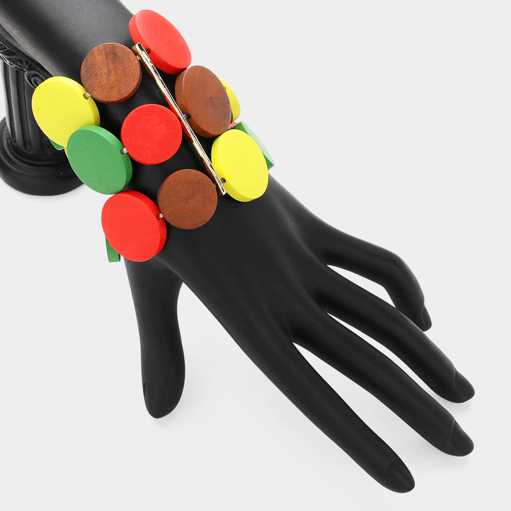 Wood Disc Plate Beaded Stretch Strand Bracelet