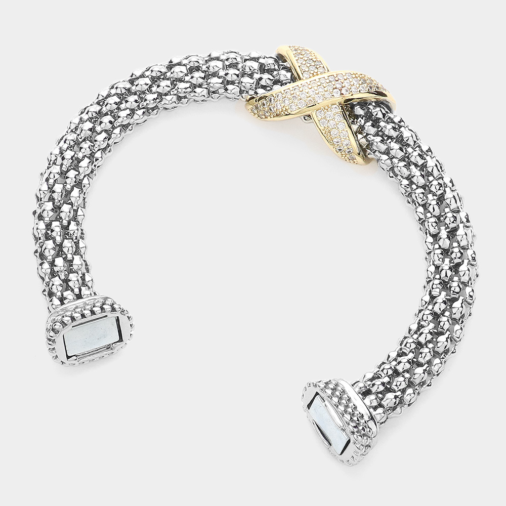 14K Gold Plated CZ Stone Paved Crisscross Pointed Mesh Metal Magnetic Bracelet
