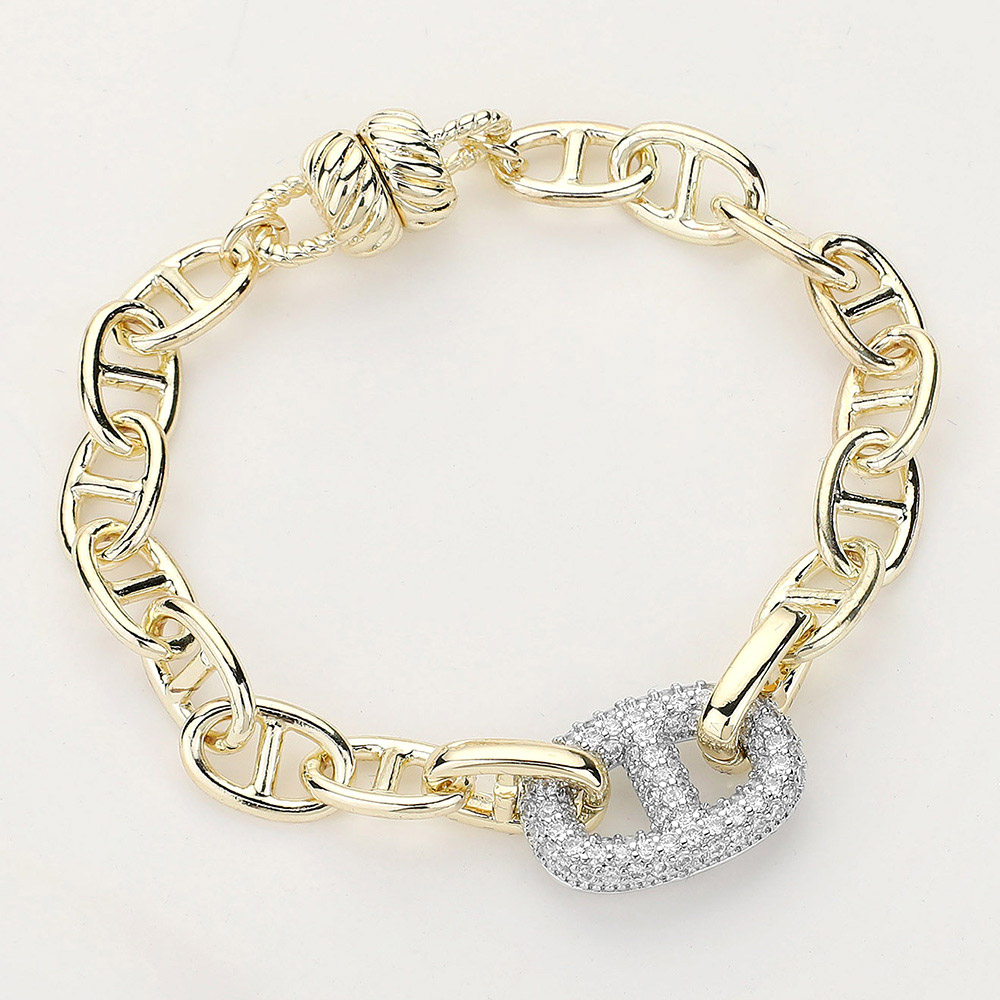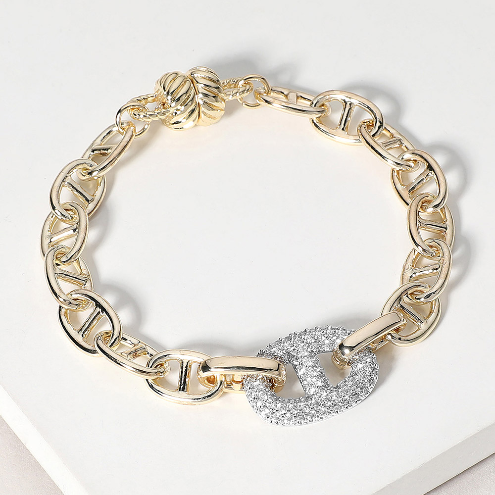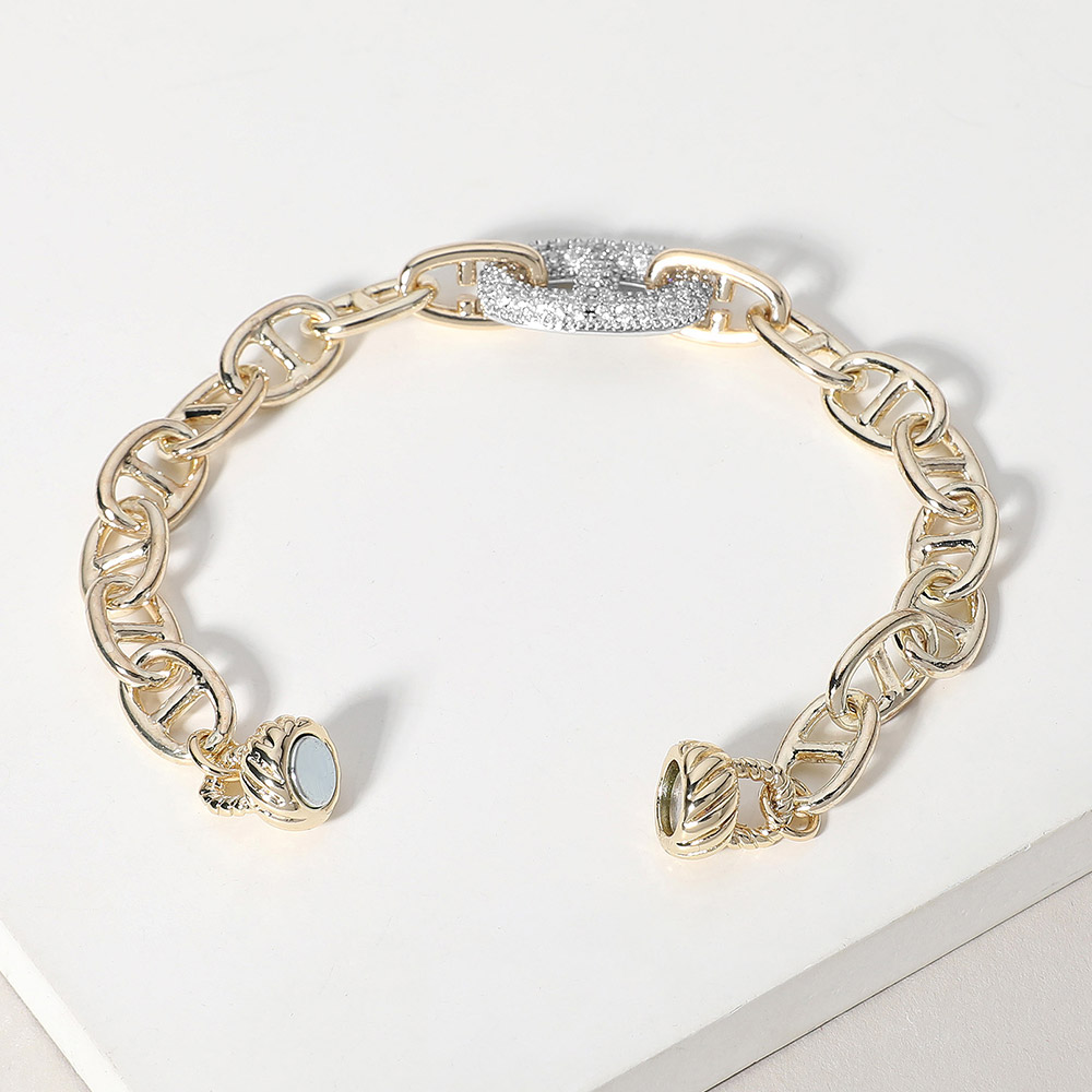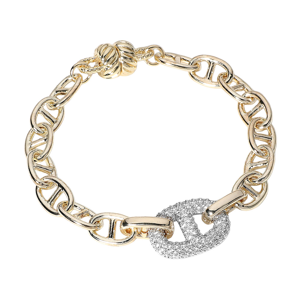 Details • Size : 0.6" H, 7.5" L • Magnetic Closure • Stylish chain link bracelet highlighted by a dazzling oval centerpiece adorned with sparkling crystals. The secure magnetic clasp ensures easy wear, blending modern elegance with timeless charm. Perfect for layering or as a statement piece to elevate casual and formal looks alike. • Gold Dipped • CZ Cubic Zirconia