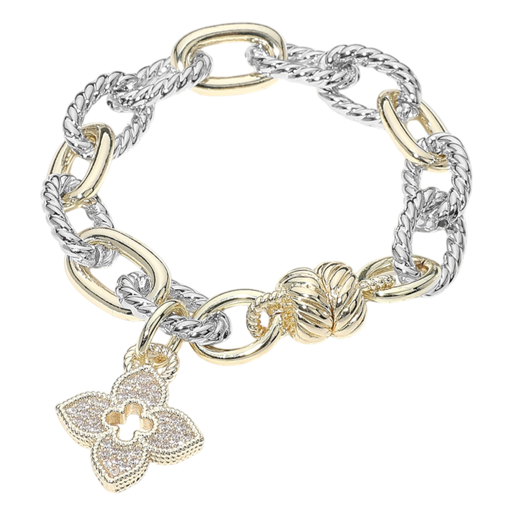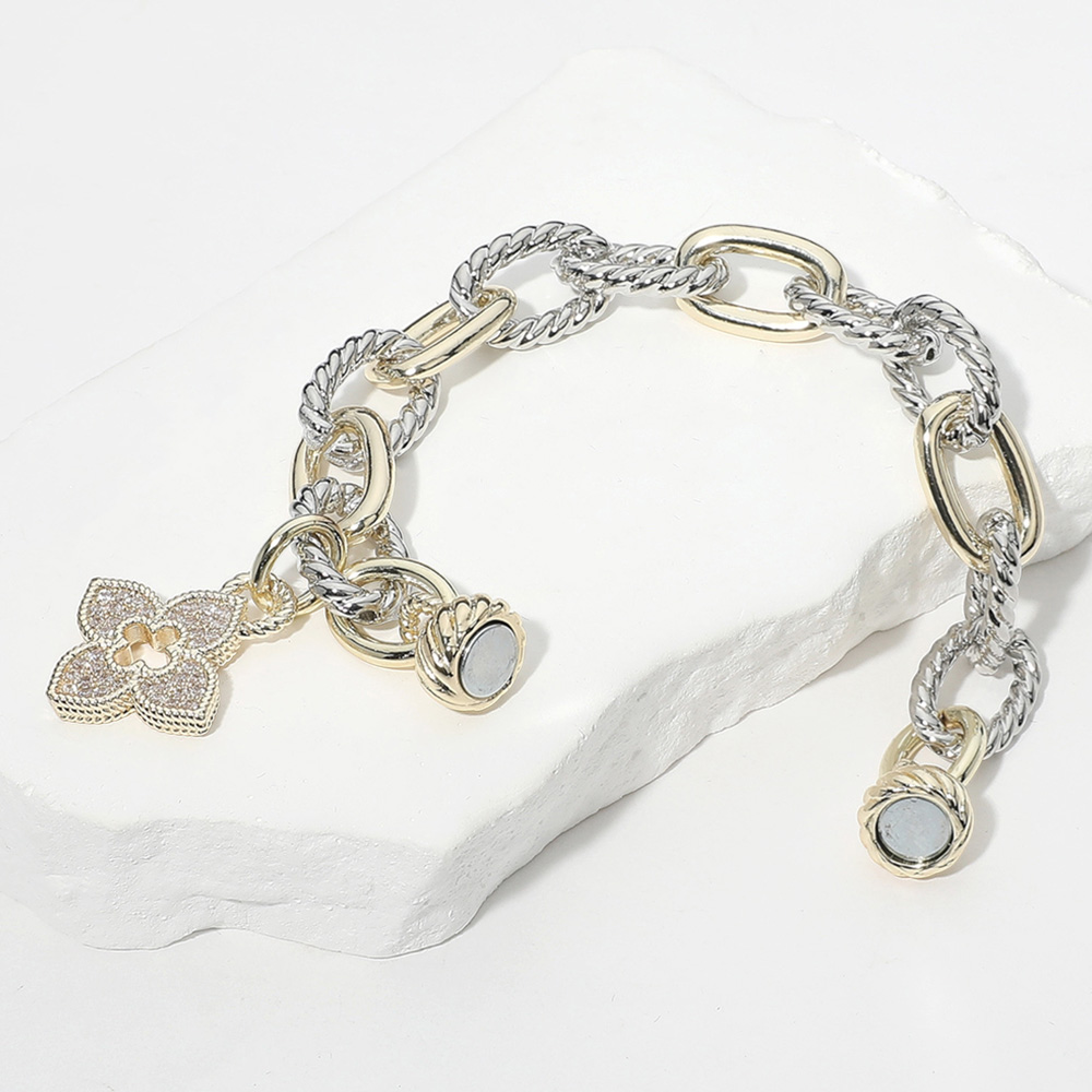 14K Gold Plated Two Tone CZ Stone Paved Clover Charm Magnetic Bracelet