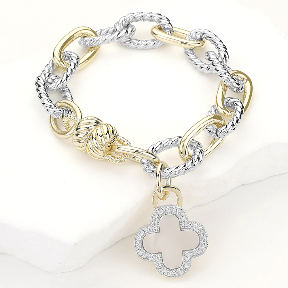 Details • Size : 0.5" H, 8" L • Charm Size : 1" X 1.25" • Magnetic Closure • Bold link bracelet featuring a mother of pearl quatrefoil charm, blending classic elegance with modern style. Designed with textured links and shimmering details, this bracelet makes a statement accessory for any look, perfect for special occasions, everyday wear, or gifting with timeless charm. • Gold Dipped • CZ Cubic Zirconia