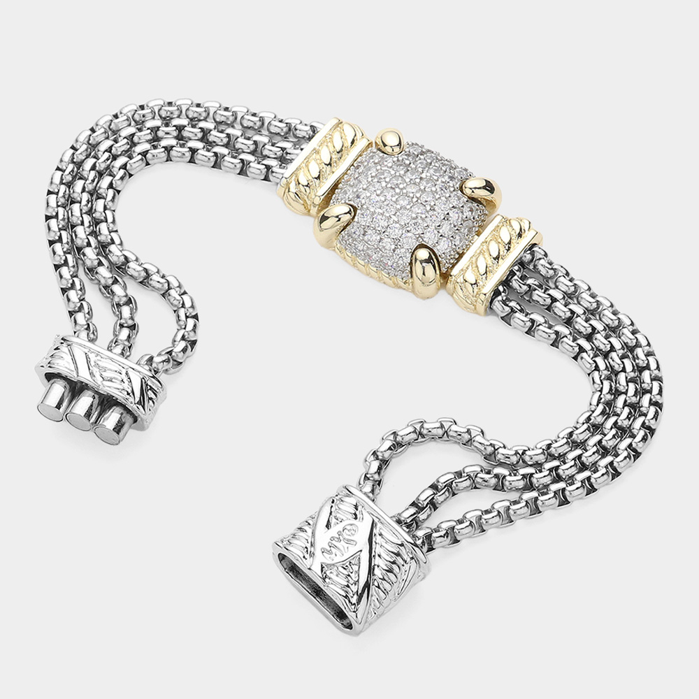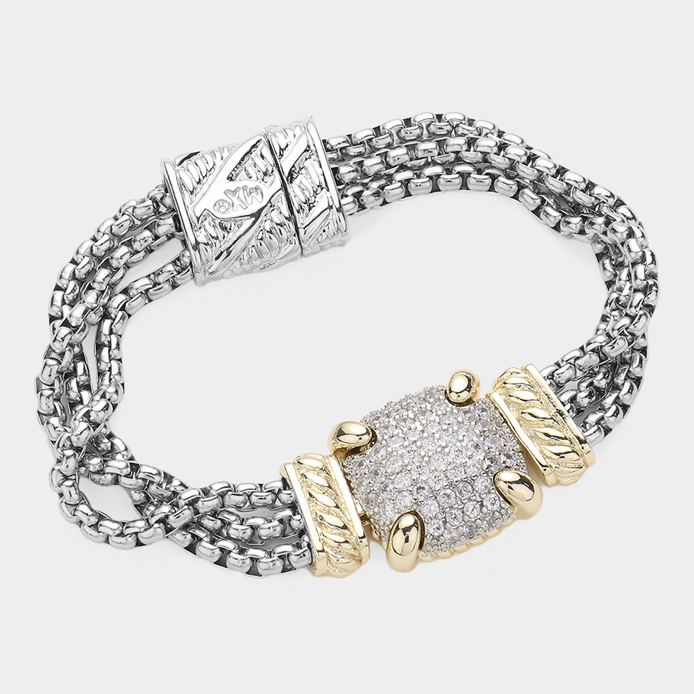 14K Gold Plated Two Tone CZ Stone Paved Square Pointed Magnetic Bracelet