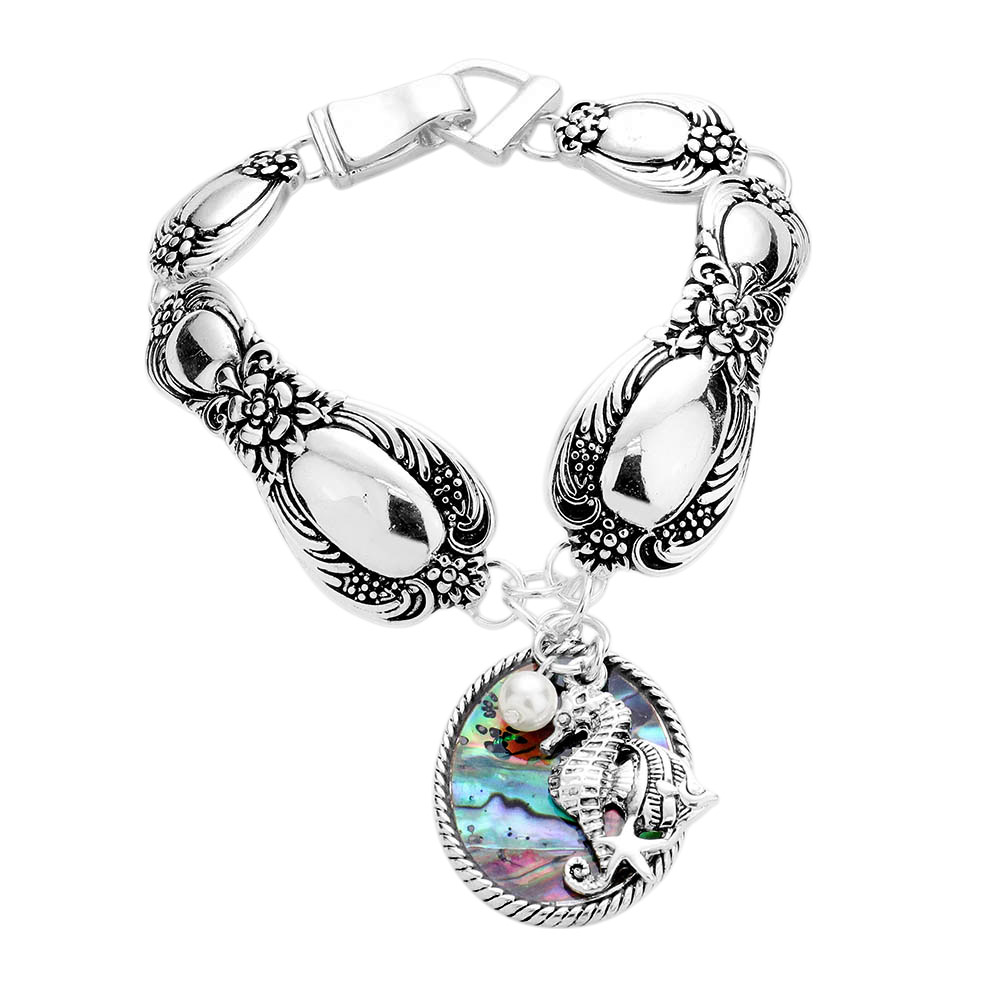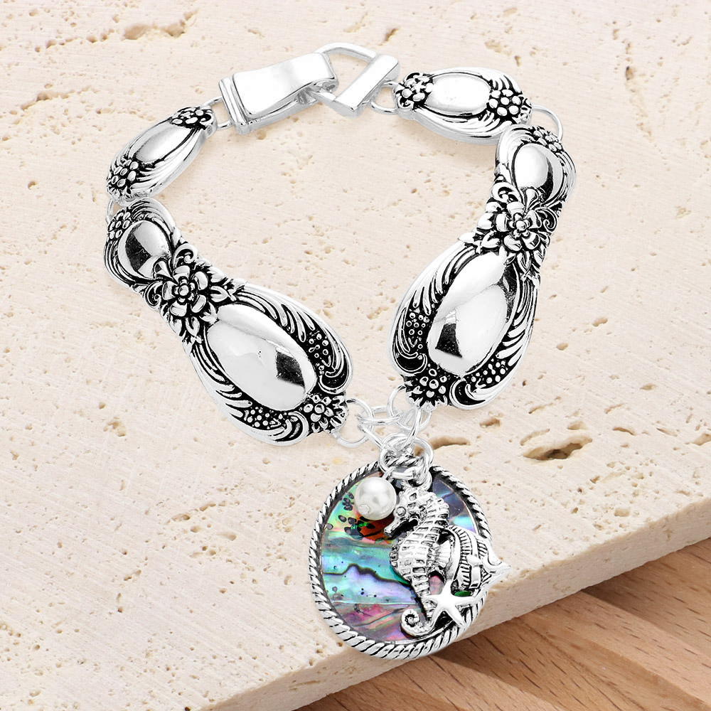 Abalone Seahorse Pearl Charm Patterned Antique Silver Bracelet