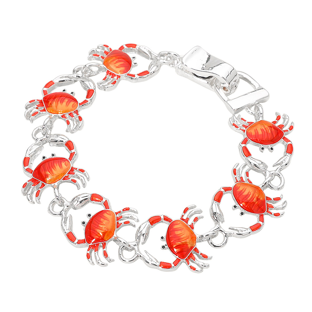 Details • Size : 0.75" H, 7" + 0.5" L • Magnetic Closure • Playful crab charm bracelet featuring detailed linked designs and a secure magnetic closure for easy wear. A fun ocean-inspired accessory ideal for beach boutiques, gift shops, and seasonal collections, offering eye-catching character, comfortable fit, and everyday coastal style appeal. • Lead and Nickel Compliant