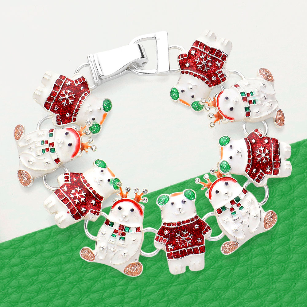 Details • Size : 0.9" H, 7" L • Magnetic Closure • Adorable holiday bracelet featuring festive bears in cozy sweaters, perfect for adding playful cheer to winter outfits. Ideal for Christmas parties, seasonal gifting, or spreading joy all season long. • Lead and Nickel Compliant
