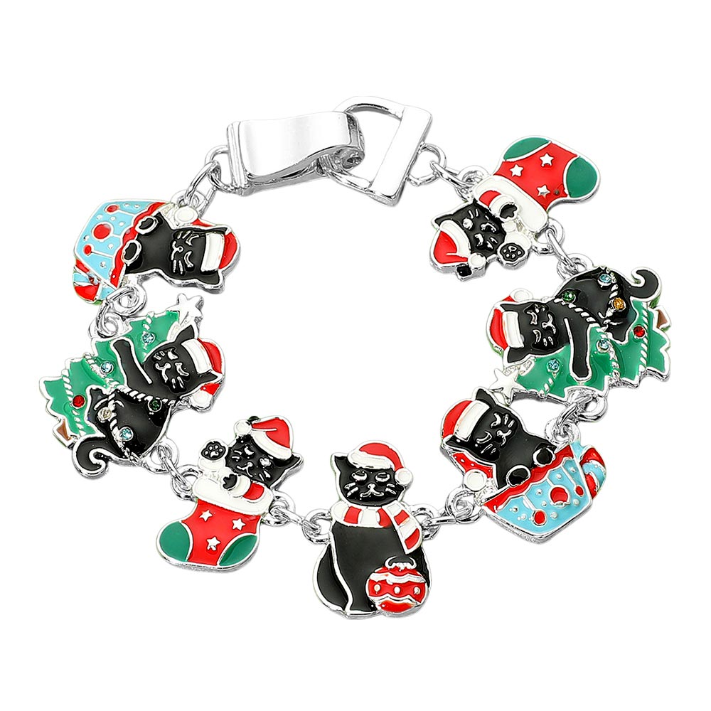 Details • Size : 0.8" H, 7.5" L • Magnetic Closure • Show your holiday spirit with this adorable Christmas cat charm bracelet. Featuring playful black cat charms in festive hats, stockings, and trees, this fun accessory is perfect for celebrating the season and spreading cheer. • Lead and Nickel Compliant