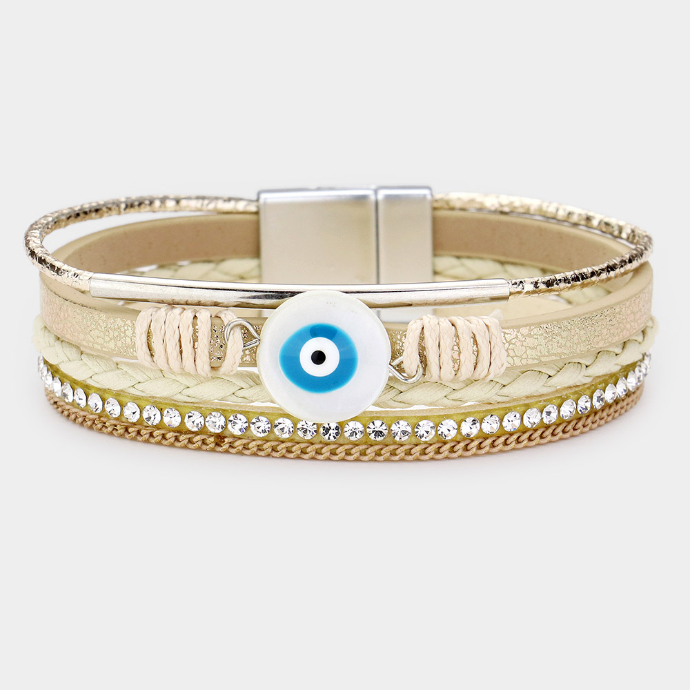 Evil Eye Accented Faux Leather Magnetic Bracelet