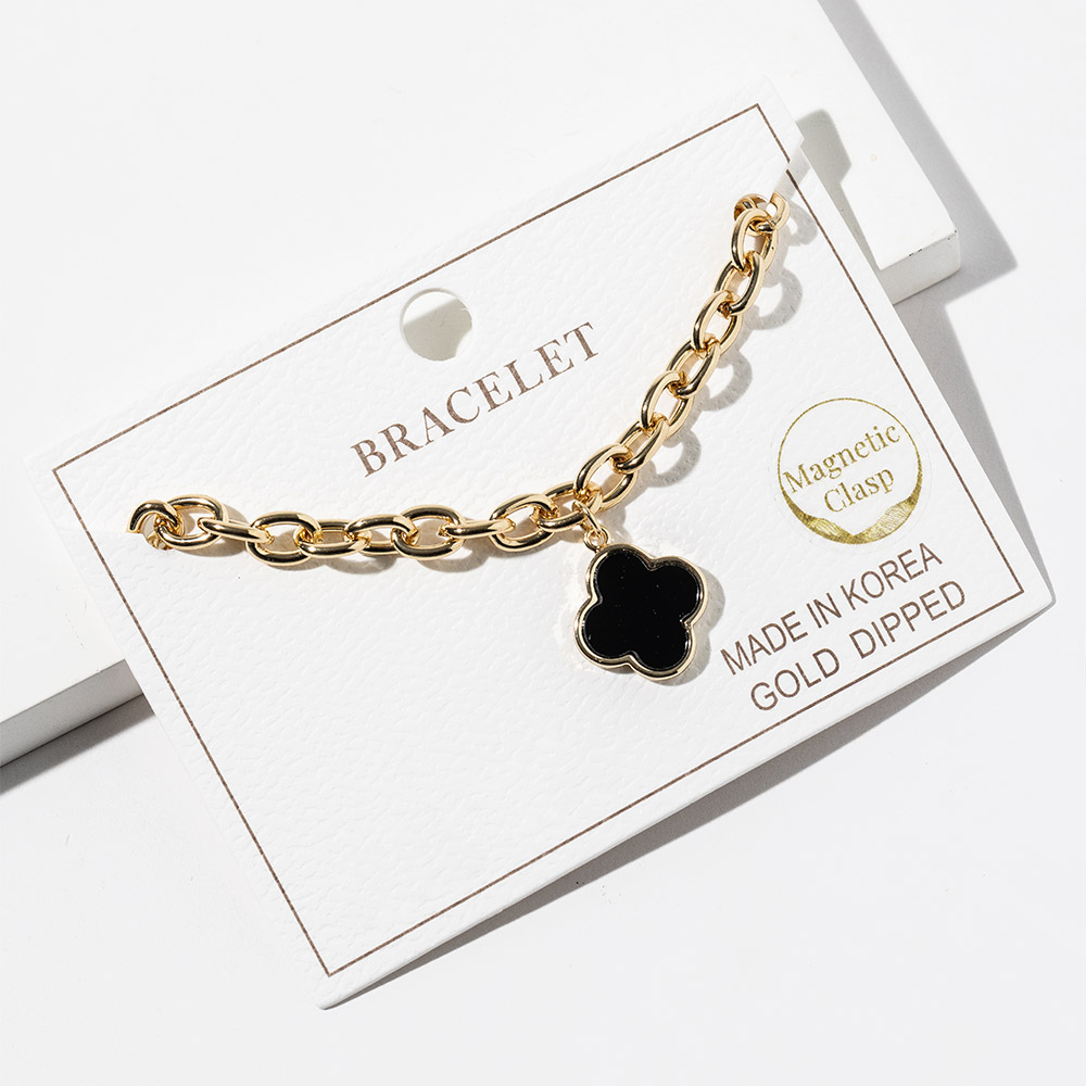 Details • Size : 0.25" H, 7" + 1" L • Charm Size : 0.6" X 0.6" • Magnetic Clasp Closure • Elevate your everyday style with this charming link bracelet featuring a delicate quatrefoil drop accent and an easy magnetic closure for effortless wear. Its polished shine and elegant silhouette make it perfect for stacking, gifting, or adding a touch of refinement to any look. Ideal for casual or dressy outfits. • Gold Dipped • Lead and Nickel Compliant • Made In Korea
