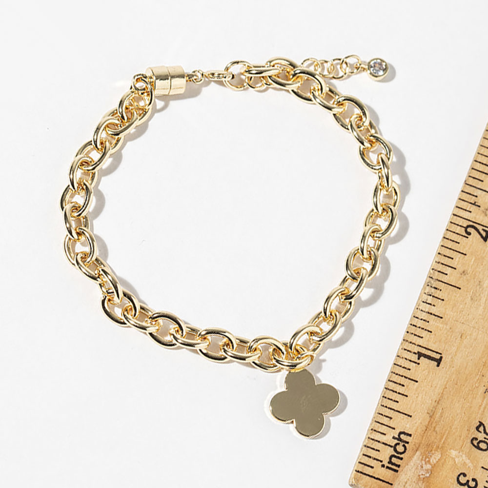 Details • Size : 0.25" H, 7.25" + 1" L • Charm Size : 0.5" X 0.5" • Magnetic Lobster Clasp Closure • Add a touch of elegance to your style with this chain bracelet featuring a chic quatrefoil charm pendant. The timeless design pairs effortlessly with any outfit, making it a perfect everyday accessory or thoughtful gift for someone special. • Gold Dipped • Lead and Nickel Compliant • Made In Korea