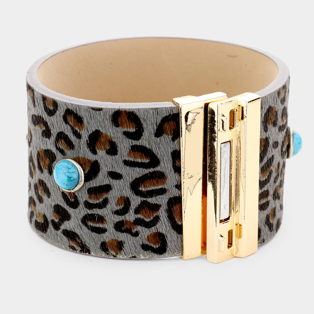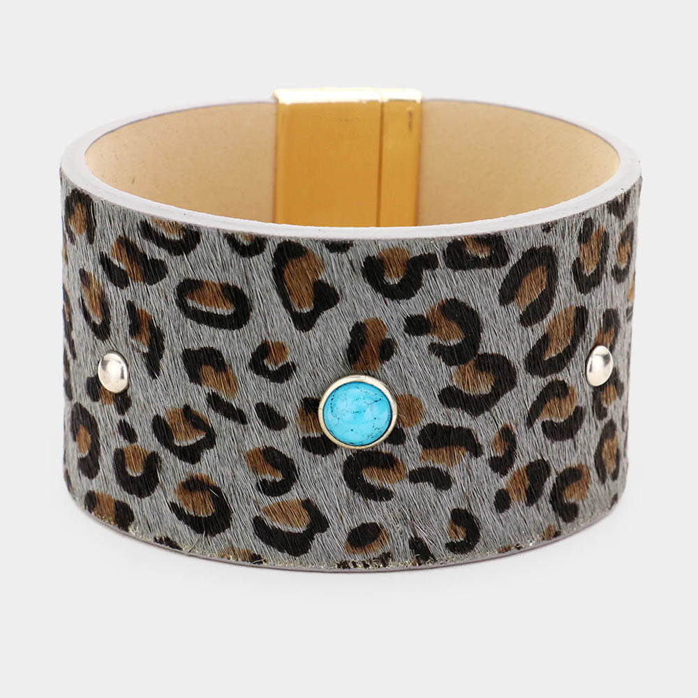Leopard Leather Turquoise Round Magnetic Bracelet