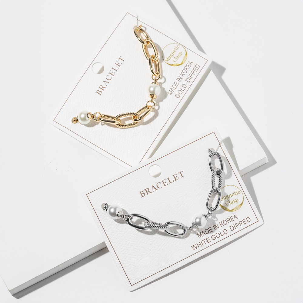 Details • Size : 0.3" H, 7" + 1" L • Magnetic Clasp Closure • Elevate your style with this chunky link bracelet featuring smooth pearl-style accents and a secure magnetic clasp for effortless wear. A bold yet elegant accessory designed to complement everyday outfits and special looks alike, offering a chic touch with timeless charm and modern appeal. • Gold Dipped • Lead and Nickel Compliant • Made In Korea