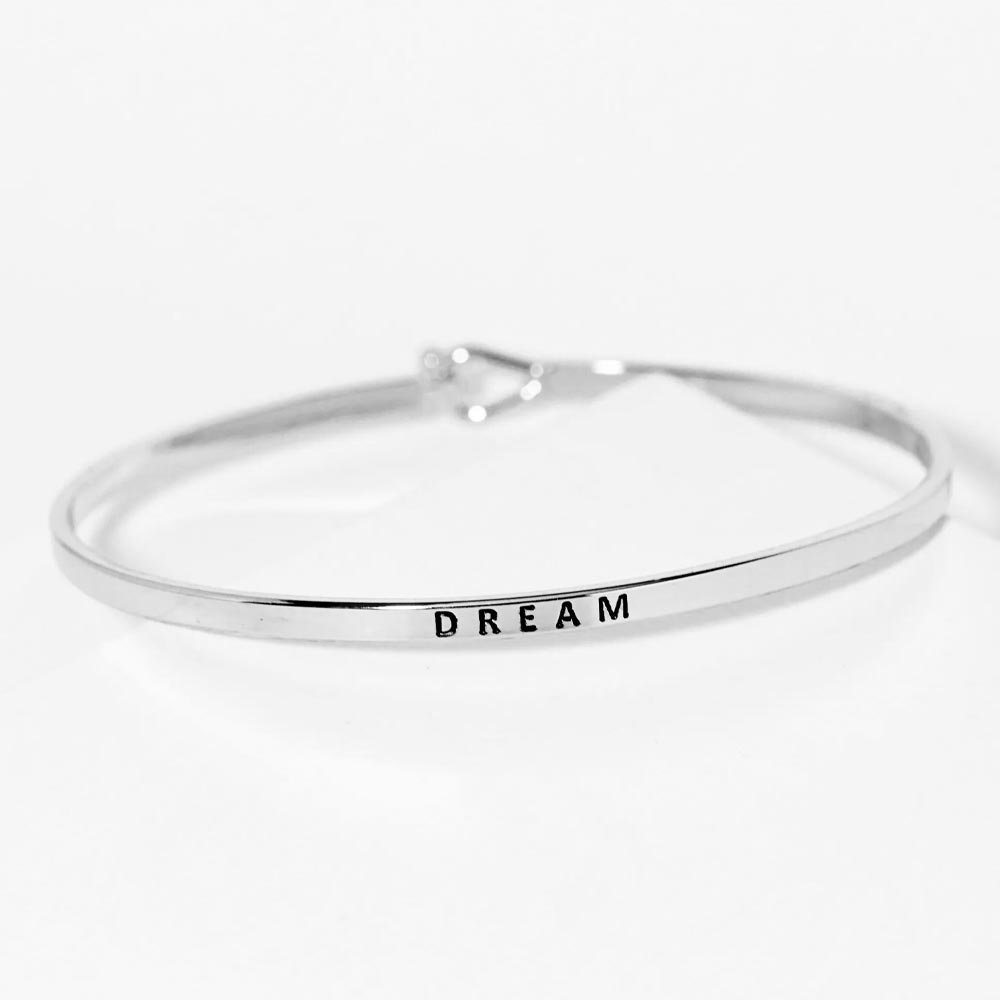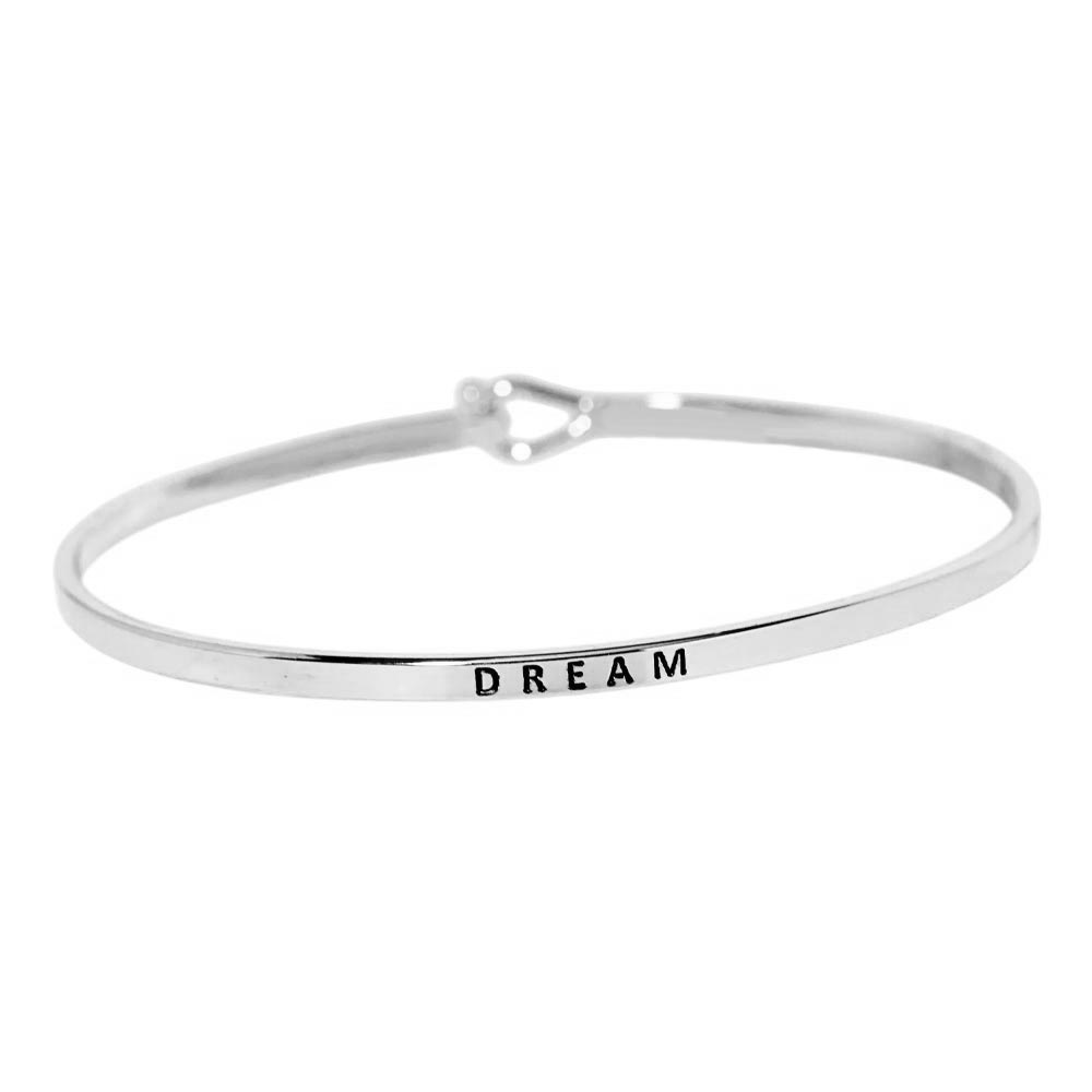 • This inspirational bangle bracelet features a sleek, narrow band engraved with the word “Dream.” Designed with a heart-shaped hook clasp for a secure fit, it serves as a daily reminder to stay inspired and reach for your goals. A meaningful accessory with timeless appeal.