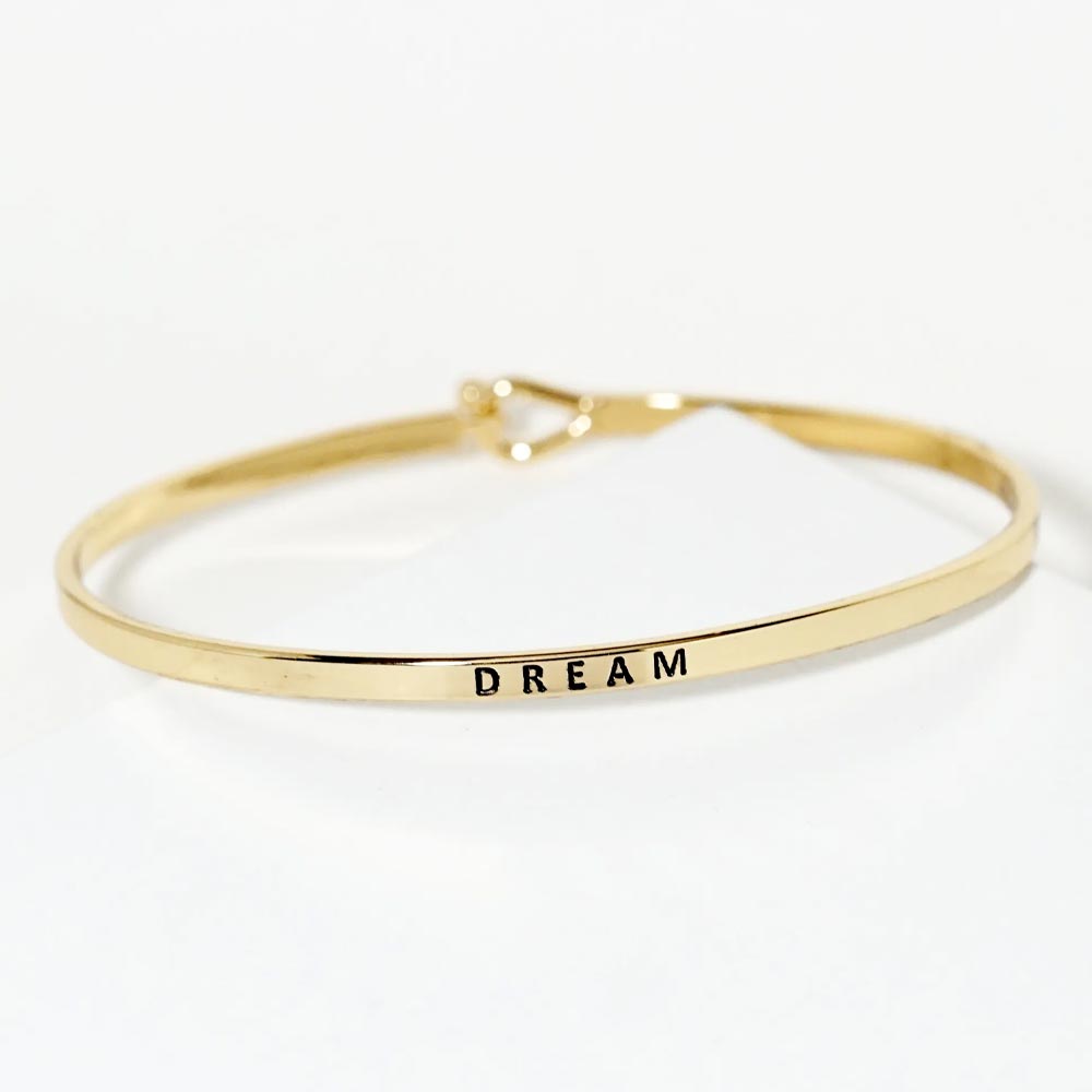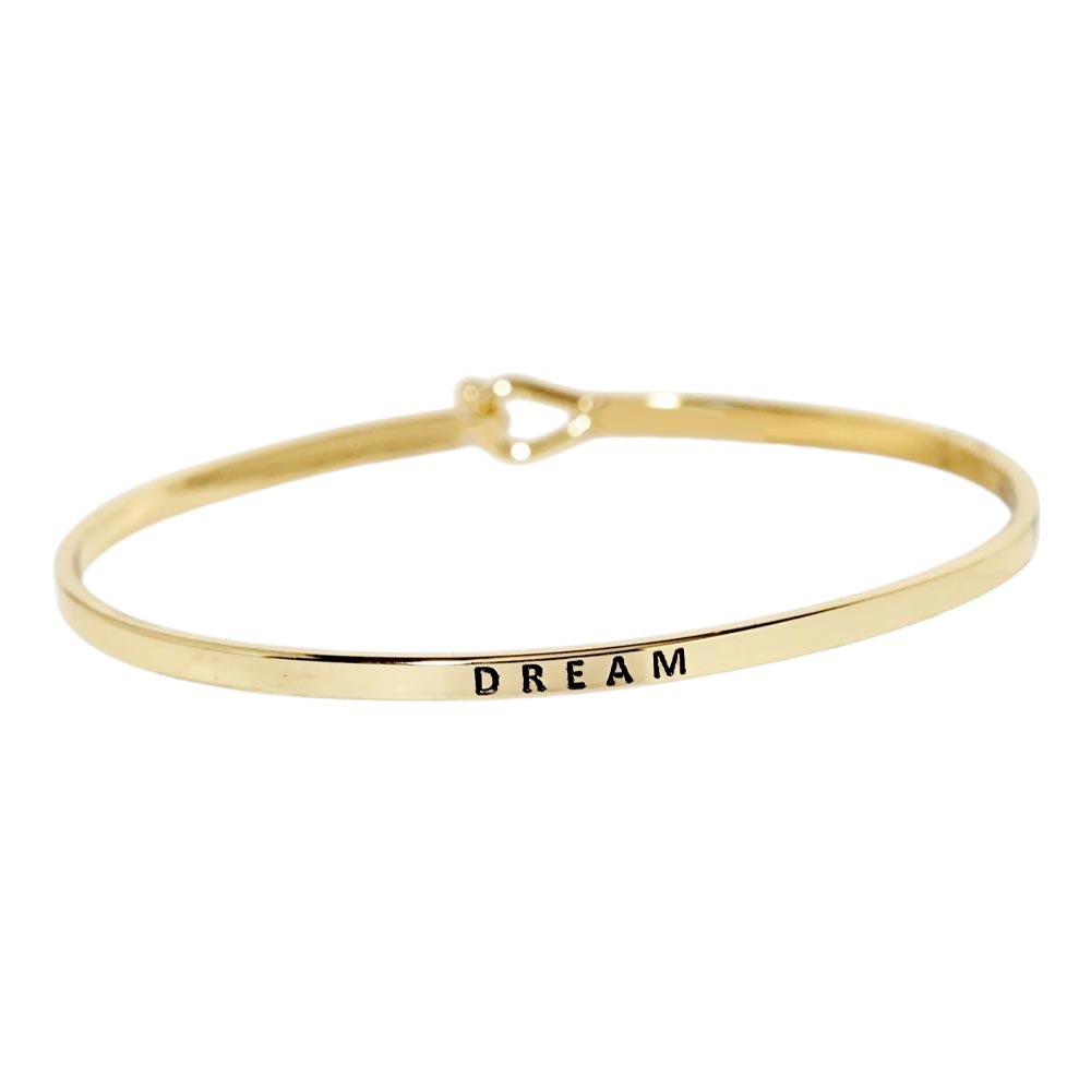 Details • Size : 0.2" H, 2.5" D • Hook Closure • This inspirational bangle bracelet features a sleek, narrow band engraved with the word “Dream.” Designed with a heart-shaped hook clasp for a secure fit, it serves as a daily reminder to stay inspired and reach for your goals. A meaningful accessory with timeless appeal. • Brass • Lead and Nickel Compliant
