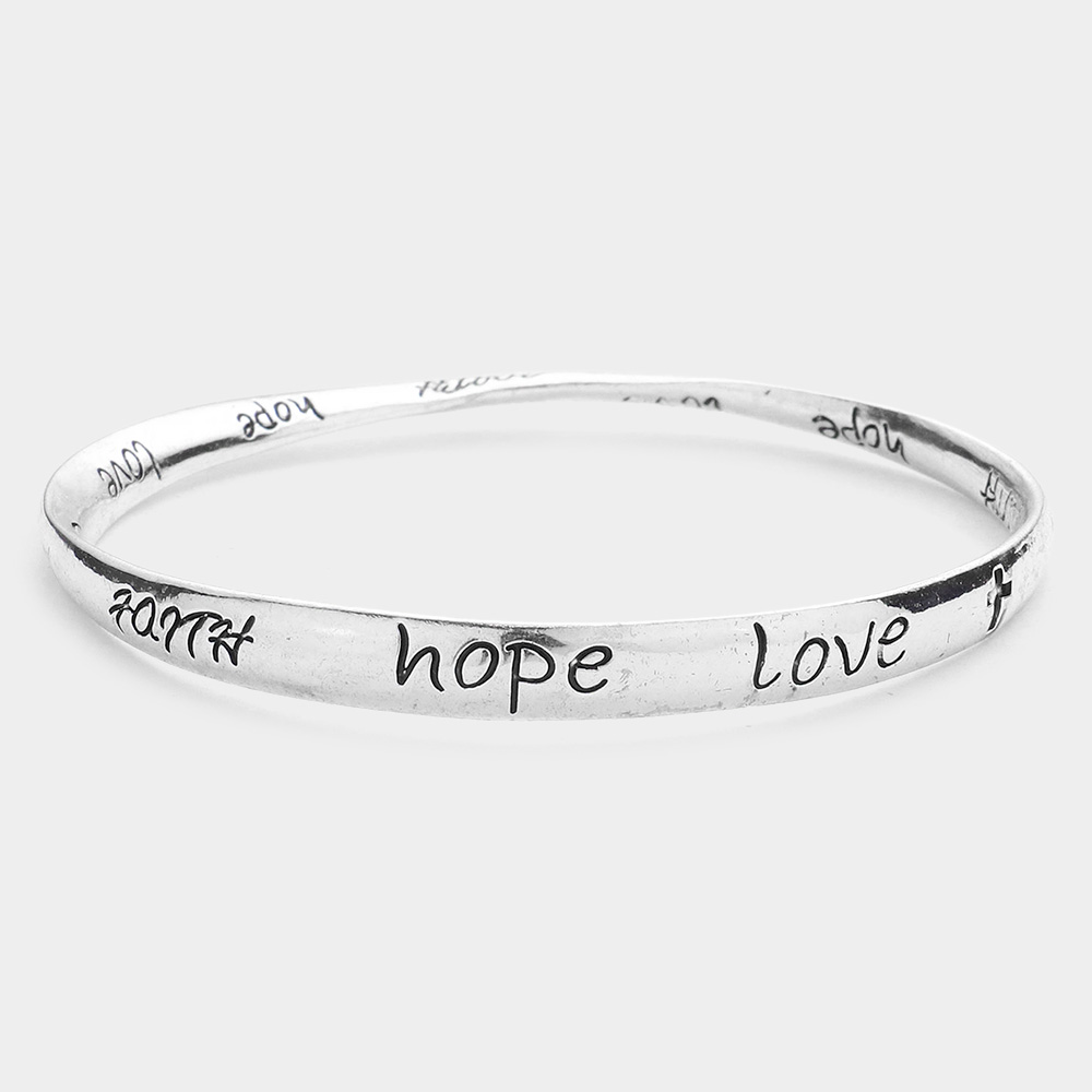 Details • Size : 0.25" H, 2.6" D • This inspirational bangle bracelet features uplifting engraved words that highlight the enduring values of faith, hope, and love. Designed as a meaningful reminder for everyday encouragement, it makes a thoughtful accessory or heartfelt gift for someone special seeking positivity. • Lead and Nickel Compliant