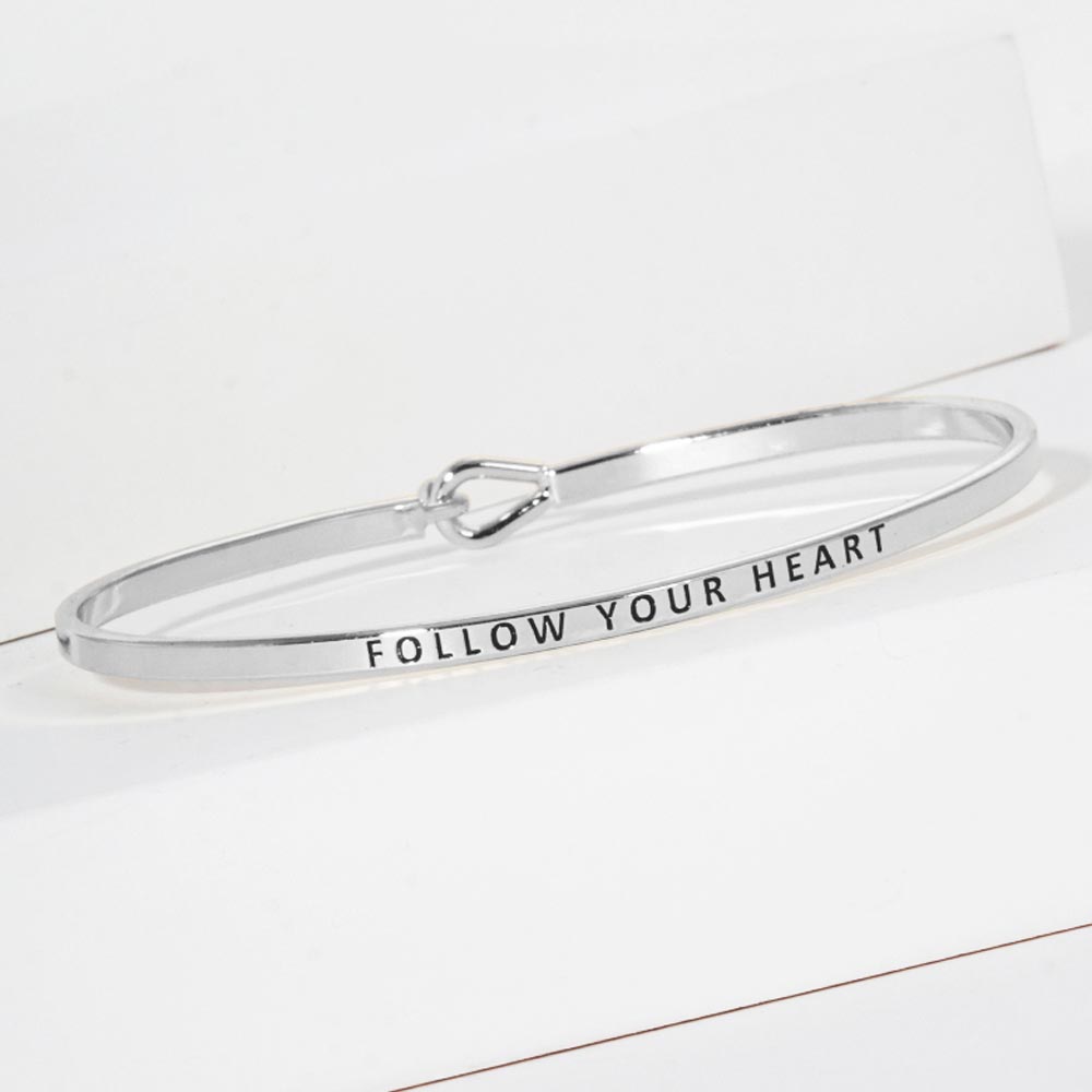 Details • Size : 0.2" H, 2.5" D • Hook Closure • This elegant bangle bracelet features a clean, minimalist band engraved with the uplifting phrase “Follow Your Heart.” Finished with a secure hook closure, it’s a meaningful everyday accessory that adds positivity and personal style to any look. Perfect for gifting or self-expression. • Lead and Nickel Compliant • Brass