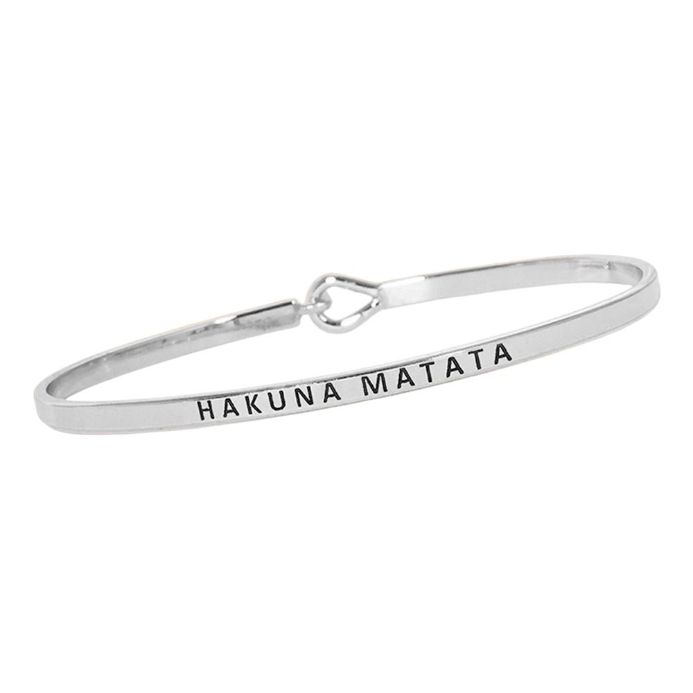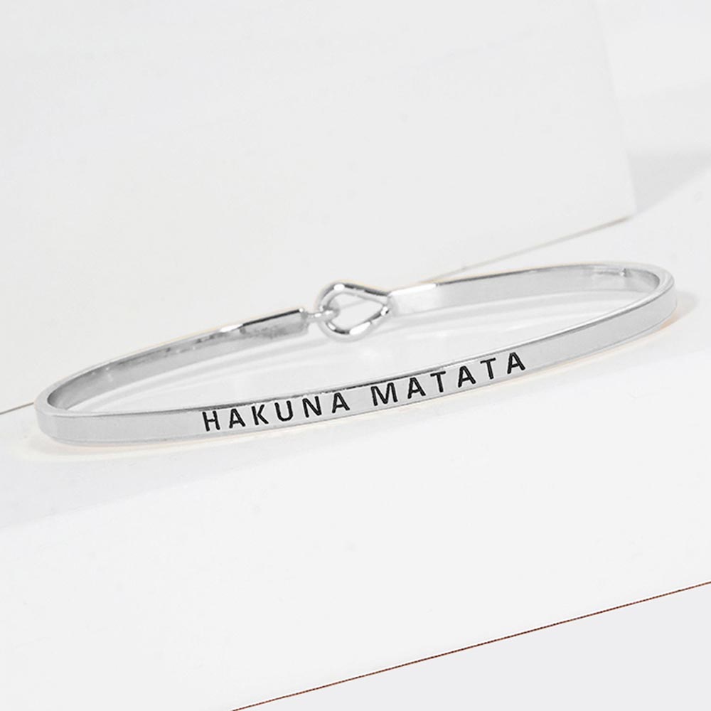 Details • Size : 0.2" H, 2.5" D • Hook Closure • This playful bangle bracelet features a slim, polished band engraved with the uplifting phrase “Hakuna Matata.” A stylish reminder to live worry-free, it includes a heart-shaped hook clasp for easy wear. Perfect for daily inspiration or as a thoughtful gift with a cheerful message. • Lead and Nickel Compliant • Brass